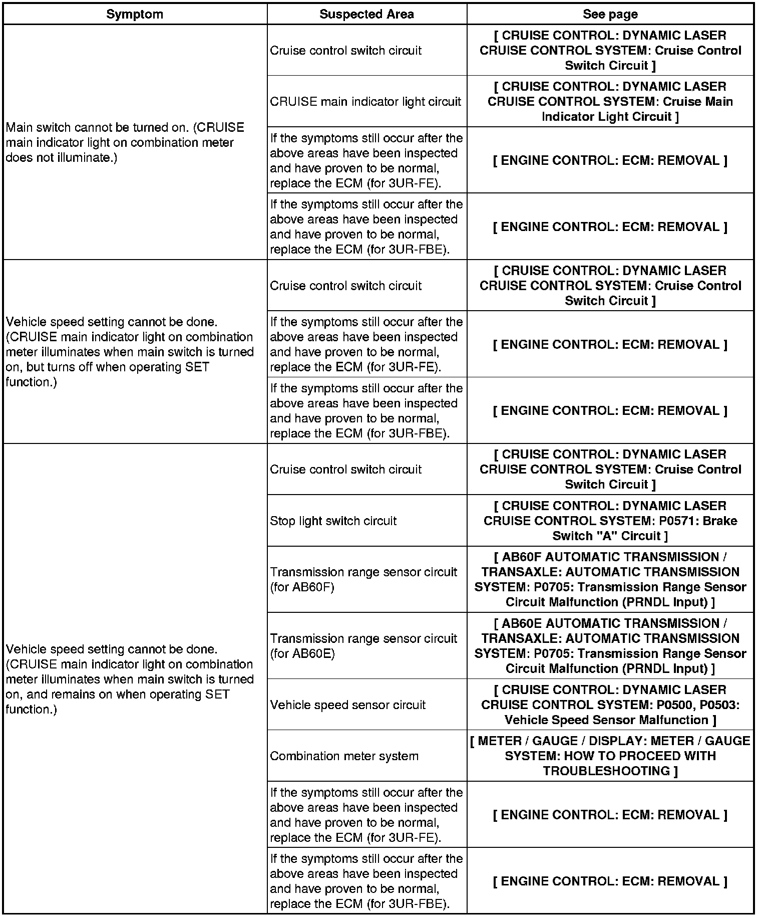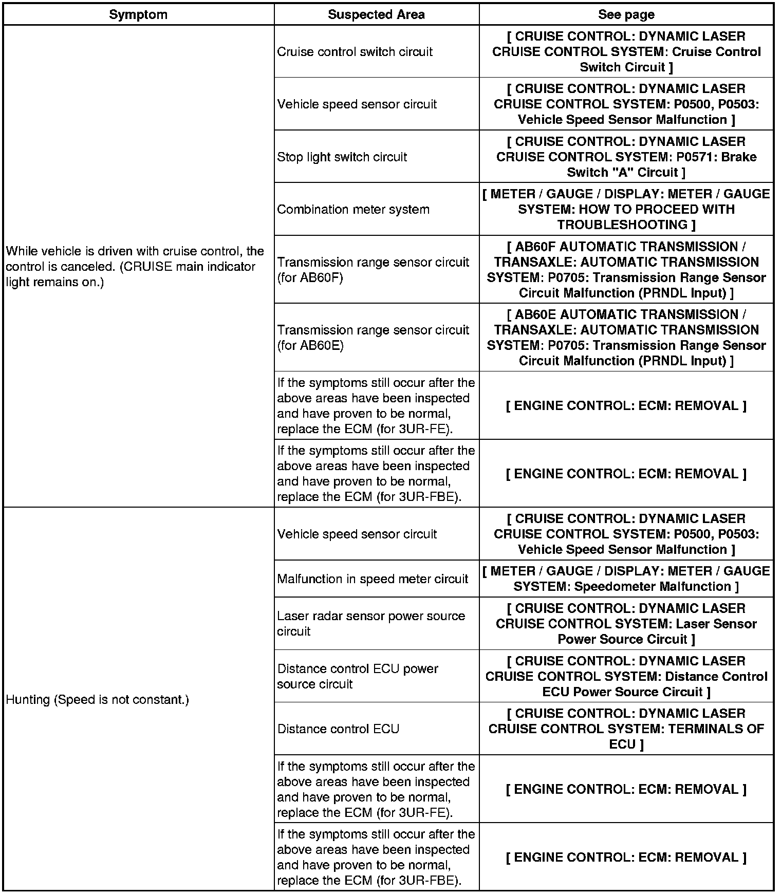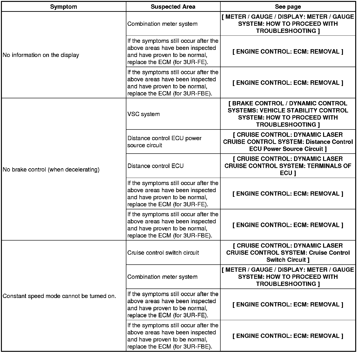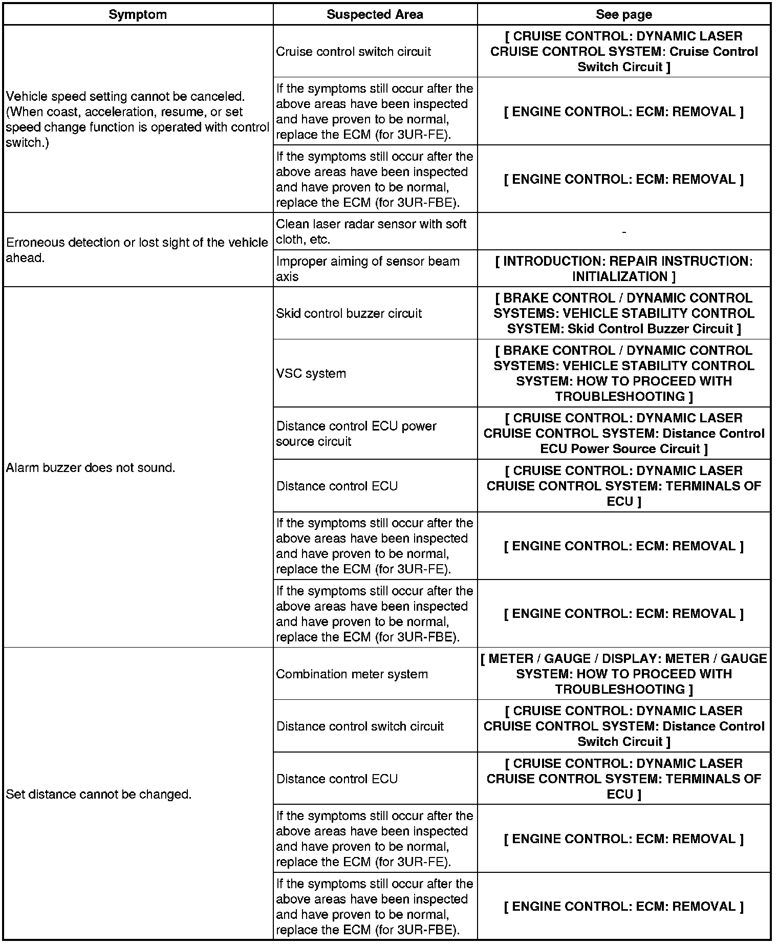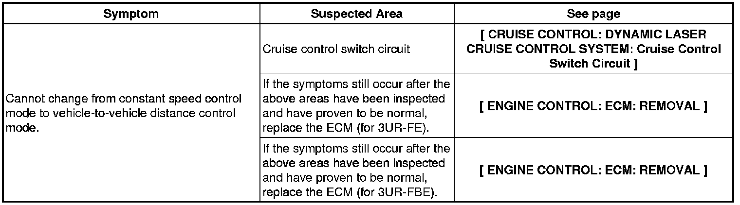 CRUISE CONTROL: DYNAMIC LASER CRUISE CONTROL SYSTEM: PROBLEM SYMPTOMS TABLE
