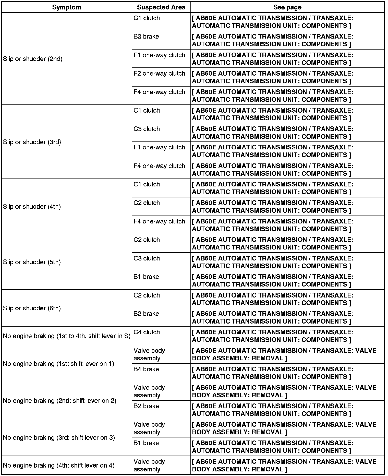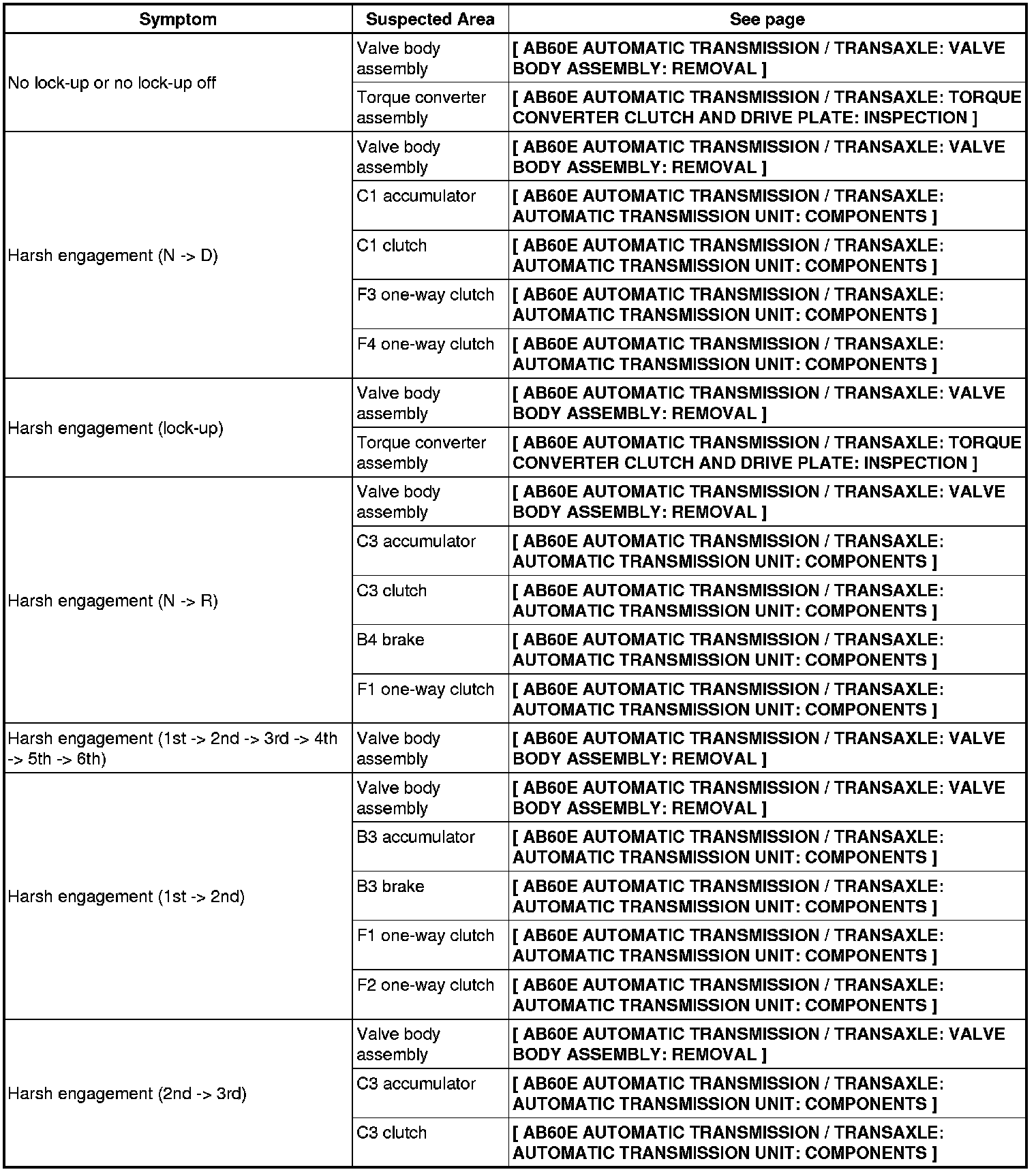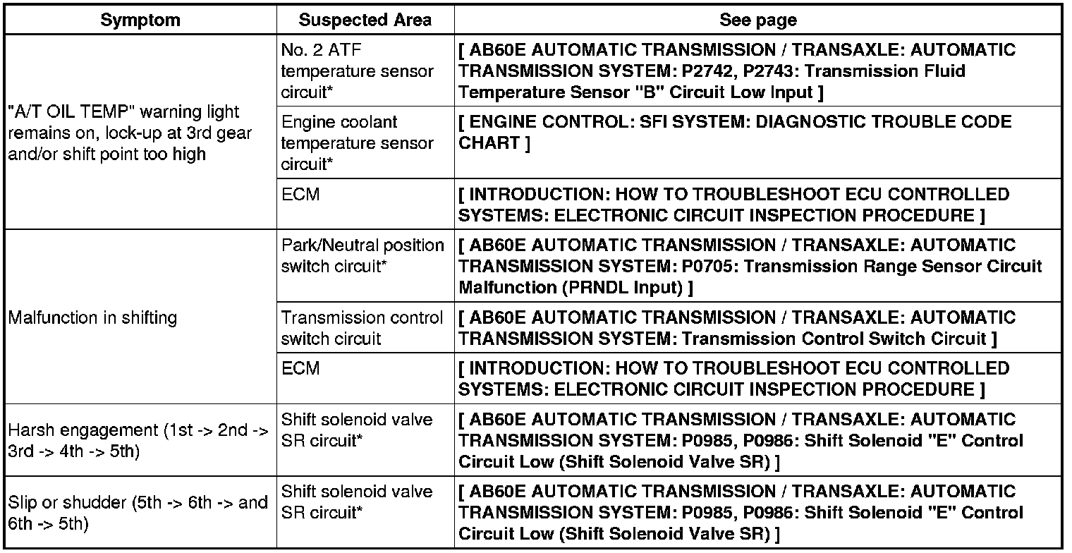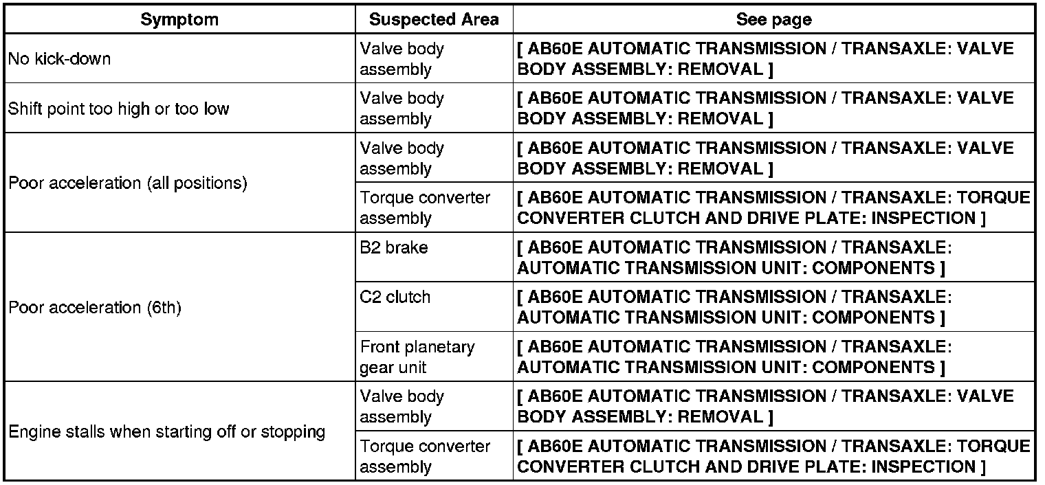 AB60E AUTOMATIC TRANSMISSION / TRANSAXLE: AUTOMATIC TRANSMISSION SYSTEM: PROBLEM SYMPTOMS TABLE