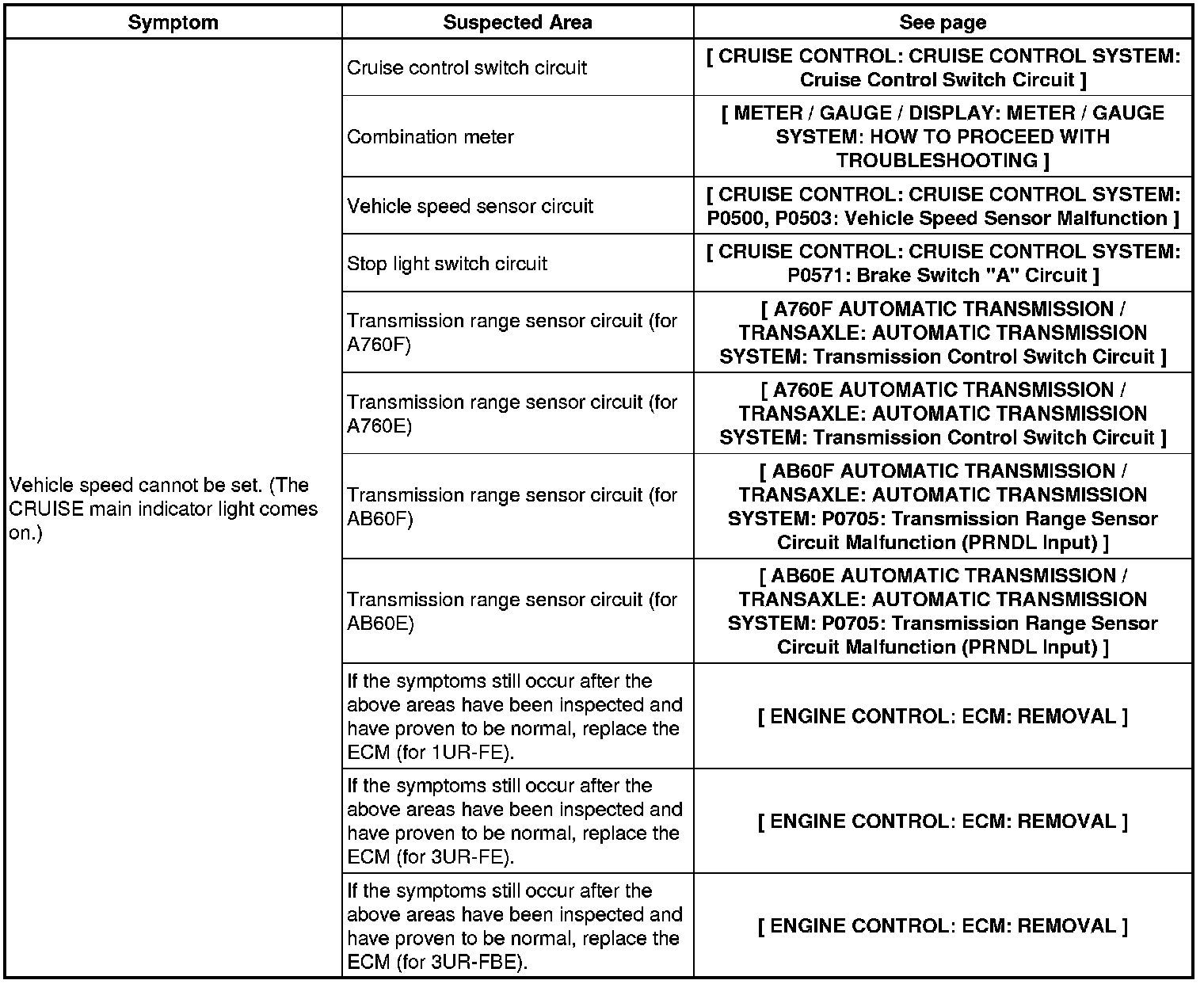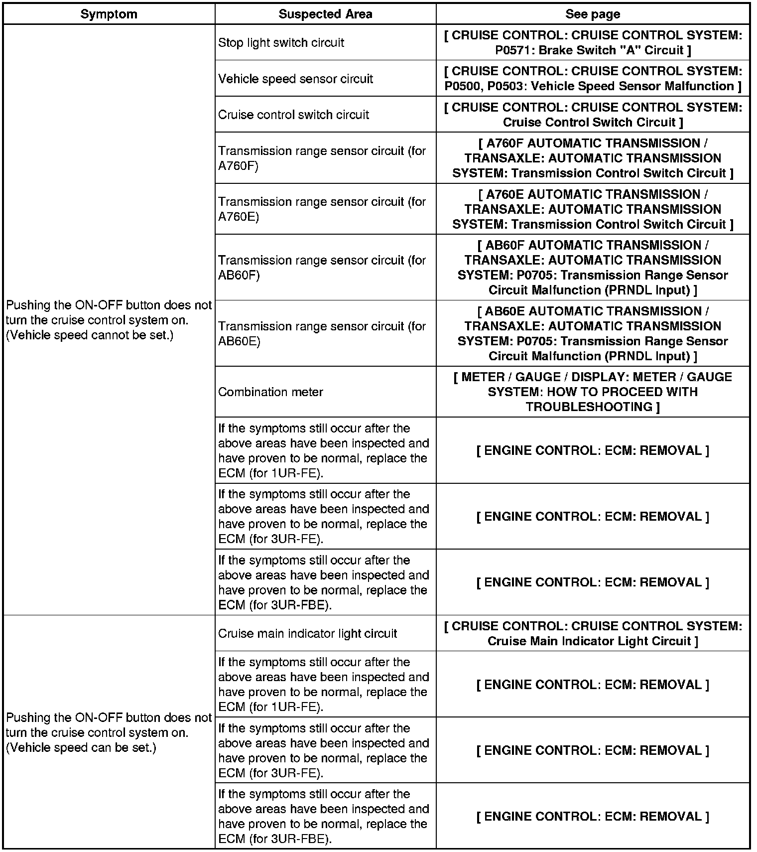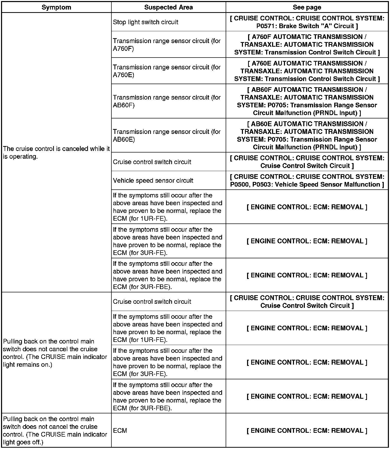 CRUISE CONTROL: CRUISE CONTROL SYSTEM: PROBLEM SYMPTOMS TABLE
