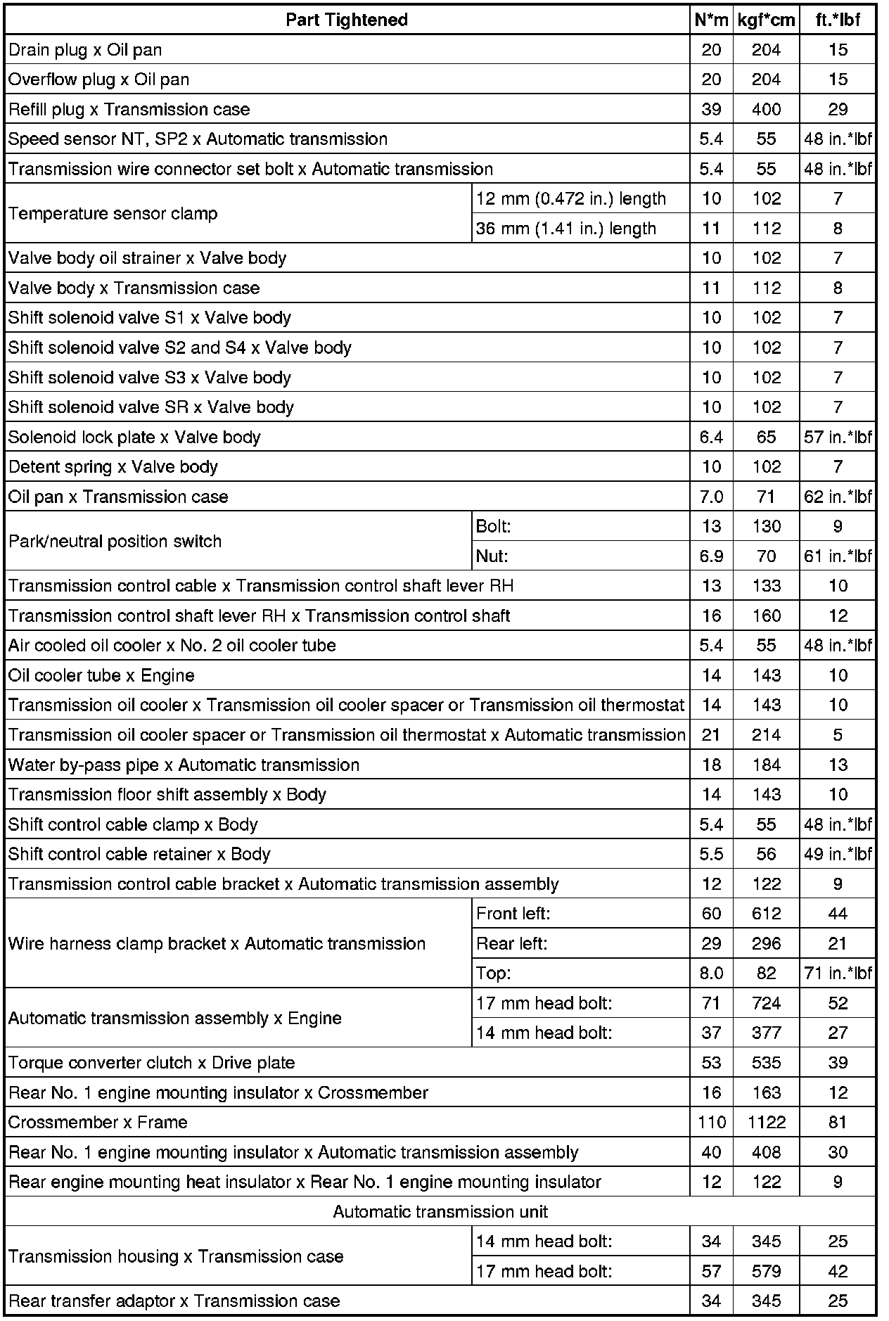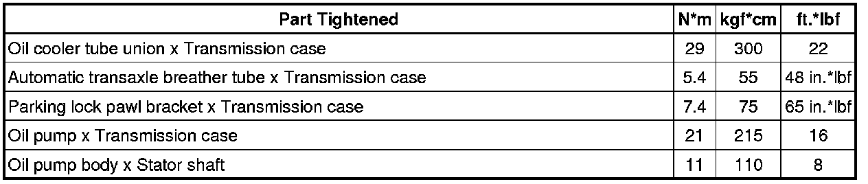SPECIFICATIONS: A760F AUTOMATIC TRANSMISSION / TRANSAXLE: TORQUE SPECIFICATIONS