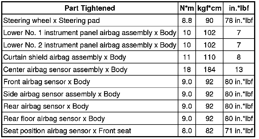 SPECIFICATIONS: SUPPLEMENTAL RESTRAINT SYSTEMS: TORQUE SPECIFICATIONS