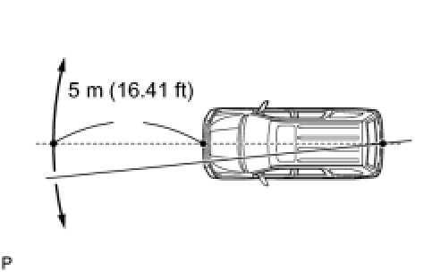 Fix one end of the string to the rear center mark and move the other end right and left at a point 5 m (16.41 ft) from the front of the vehicle.