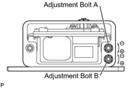 (1) Adjust the direction of the radar with adjustment bolts A and B until the values are within the auto axis adjustment range. Move the reflector from the default position as necessary (Upper/Lower, Right/Left) to find the reflector position where the current angle can be read using the Techstream. Adjust the direction of the reflector in the inverse of the direction moved by adjustment bolts A and B until the values are within the standard value ranges.