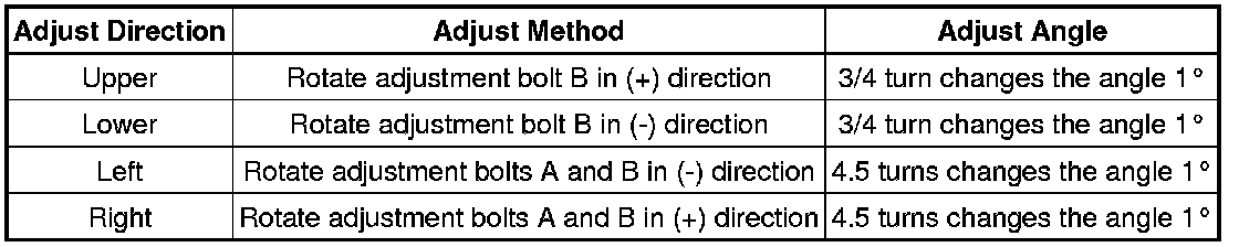 (9) If the values are out of the auto axis adjustment range or the values are not displayed, it is not possible to operate Beam Axis Adjustment. In this case, mechanically adjust the direction of the radar sensor by adjustment bolts A and B to make the values within the standard value ranges.
