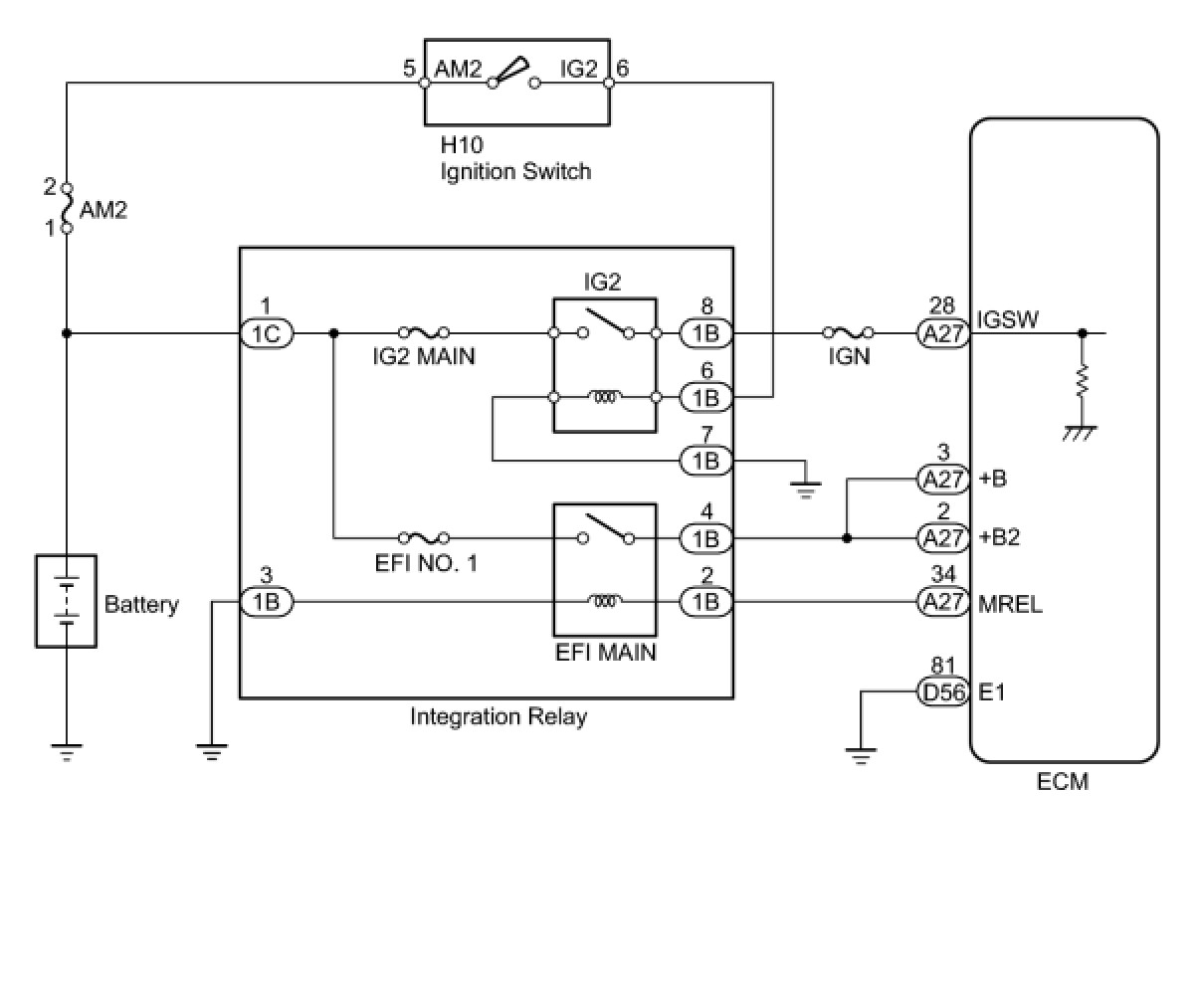 When the ignition switch is turned to ON, the battery voltage is applied to the IGSW of the ECM. The output signal from the MREL terminal of the ECM causes a current to flow to the coil, closing the contacts of the integration relay (EFI MAIN relay) and supplying power to either terminal +B or +B2 of the ECM.