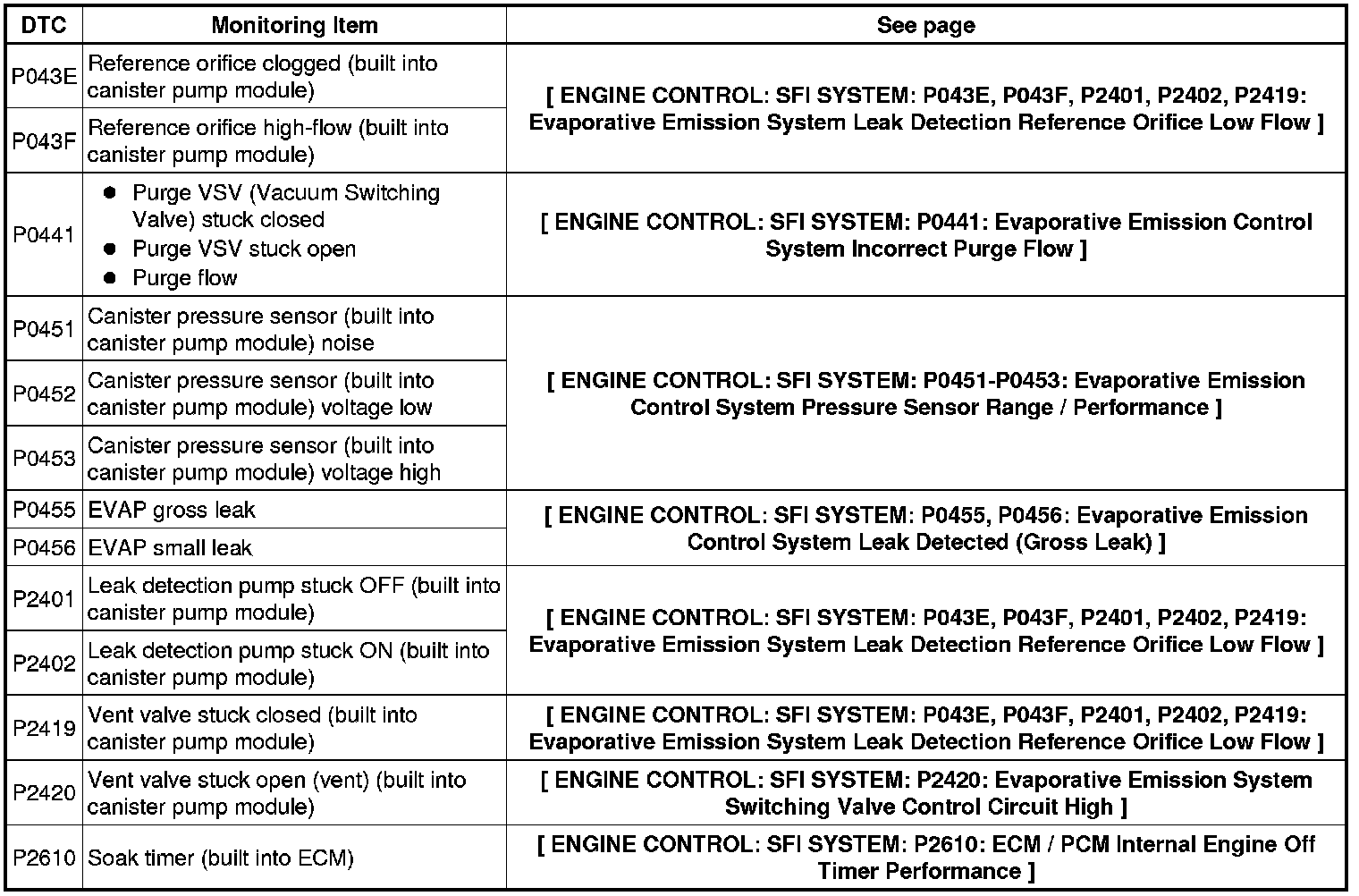 The leak detection pump creates negative pressure (vacuum) in the EVAP system and the pressure is measured. Finally, the ECM monitors for leaks from the EVAP system, and malfunctions in both the canister pump module and purge VSV, based on the EVAP pressure.