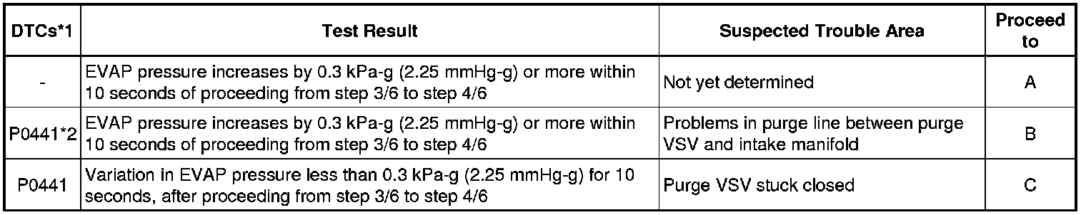 * *2: This result suggests that due to purge line blockage or purge VSV malfunction, the DTC was stored by the purge flow monitor while the engine was running, or that key-off monitor test result were nearly borderline values.