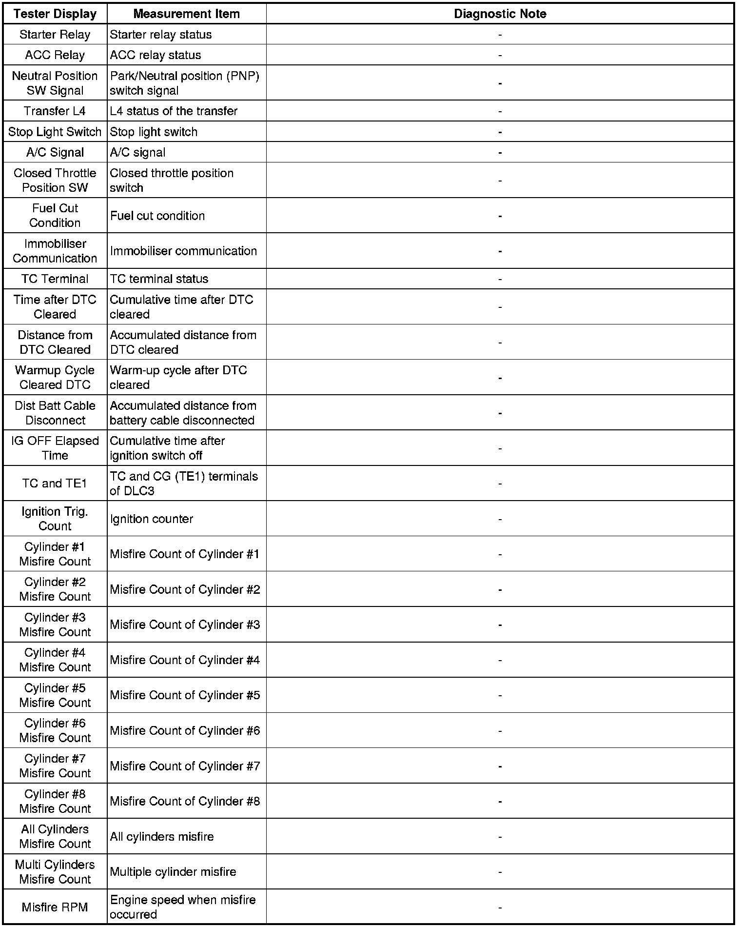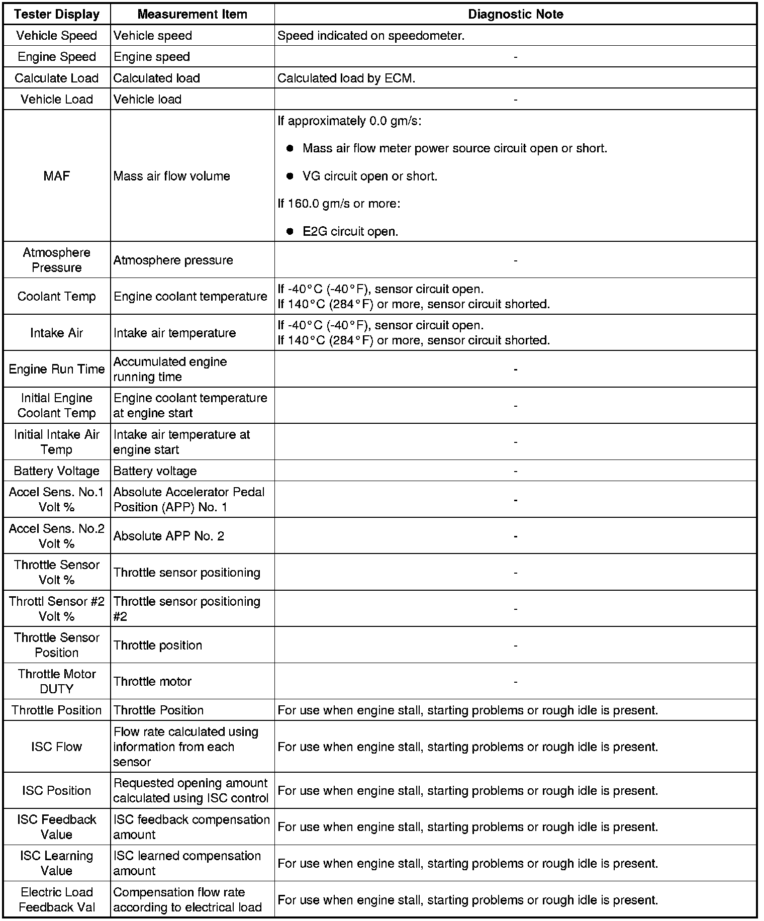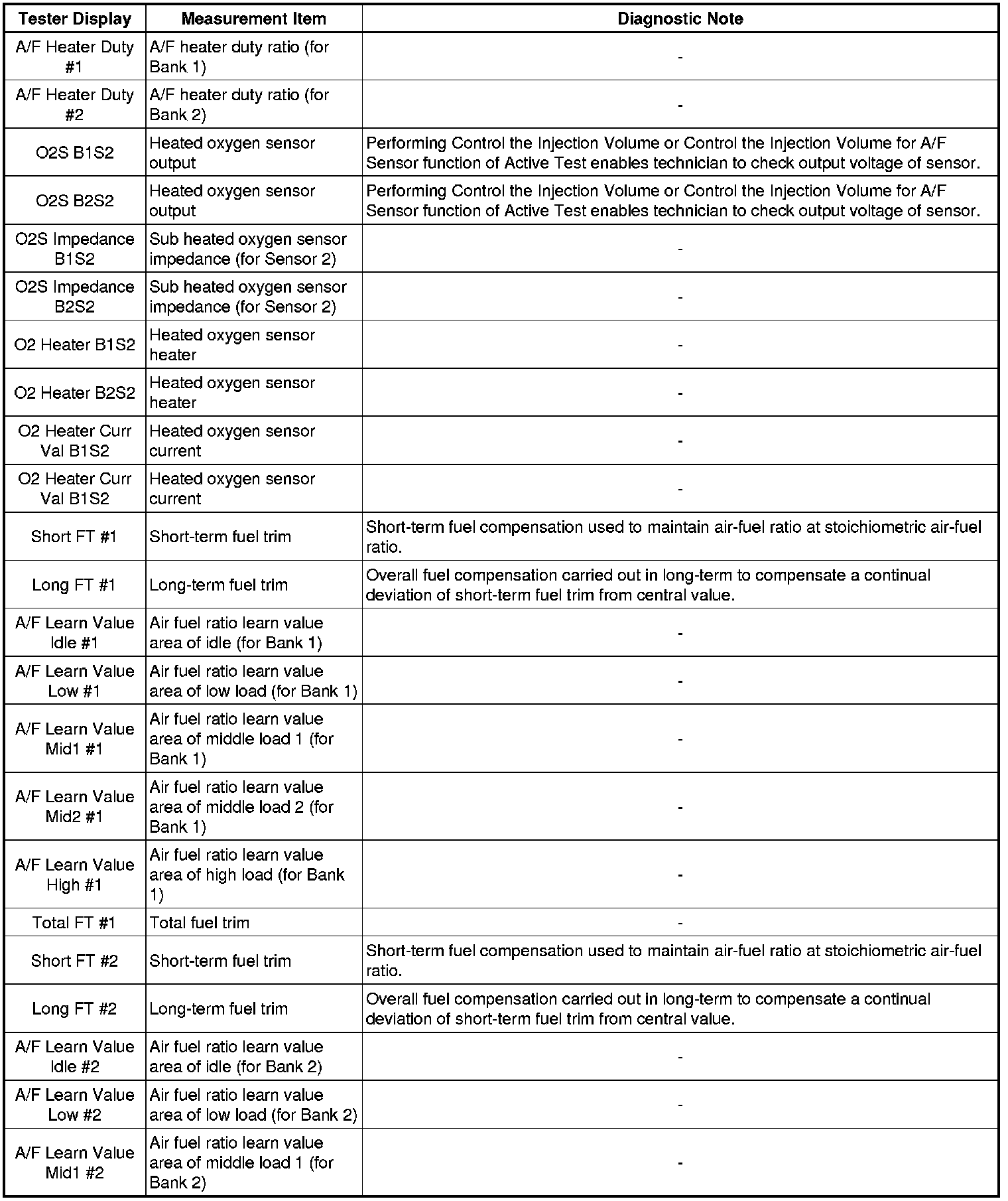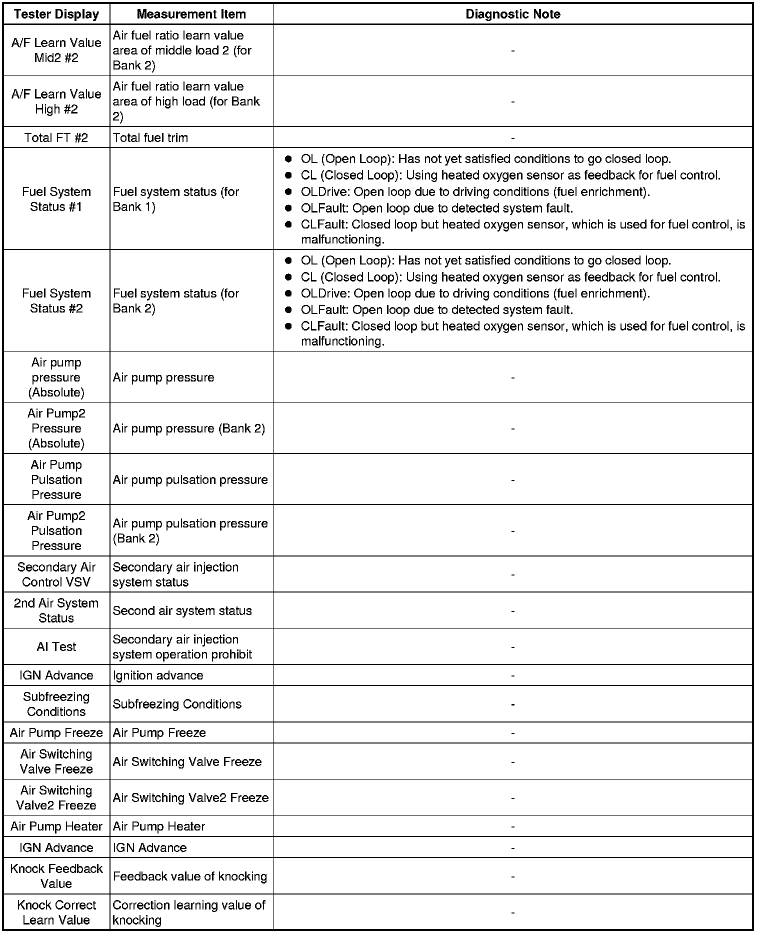 * Freeze frame data records the engine conditions (fuel system, calculated load, engine coolant temperature, fuel trim, engine speed, vehicle speed, etc.) when a malfunction is detected. When troubleshooting, it can help determine if the vehicle was moving or stationary, the engine was warmed up or not, the air-fuel ratio was Lean or Rich, and other data from the time the malfunction occurred.
