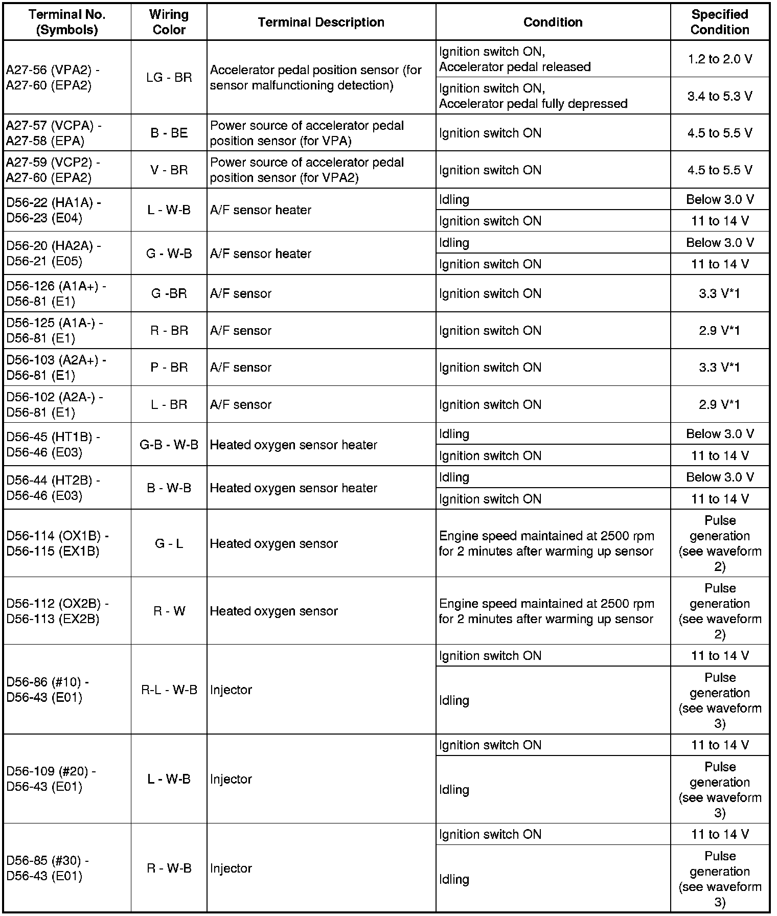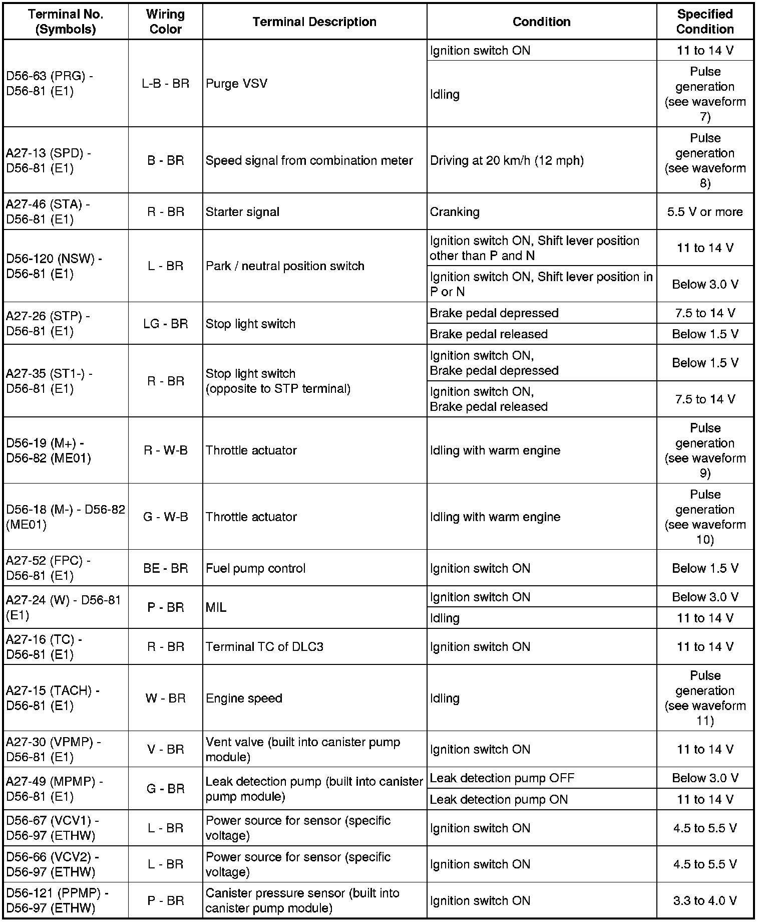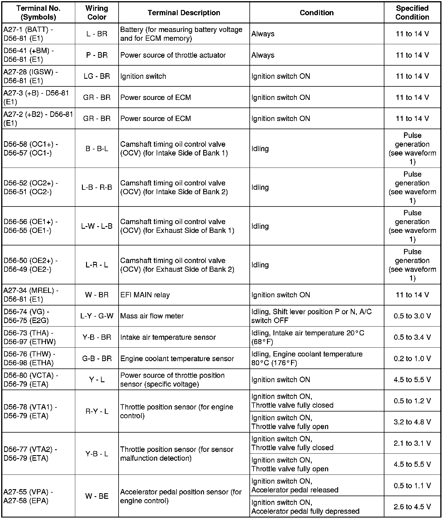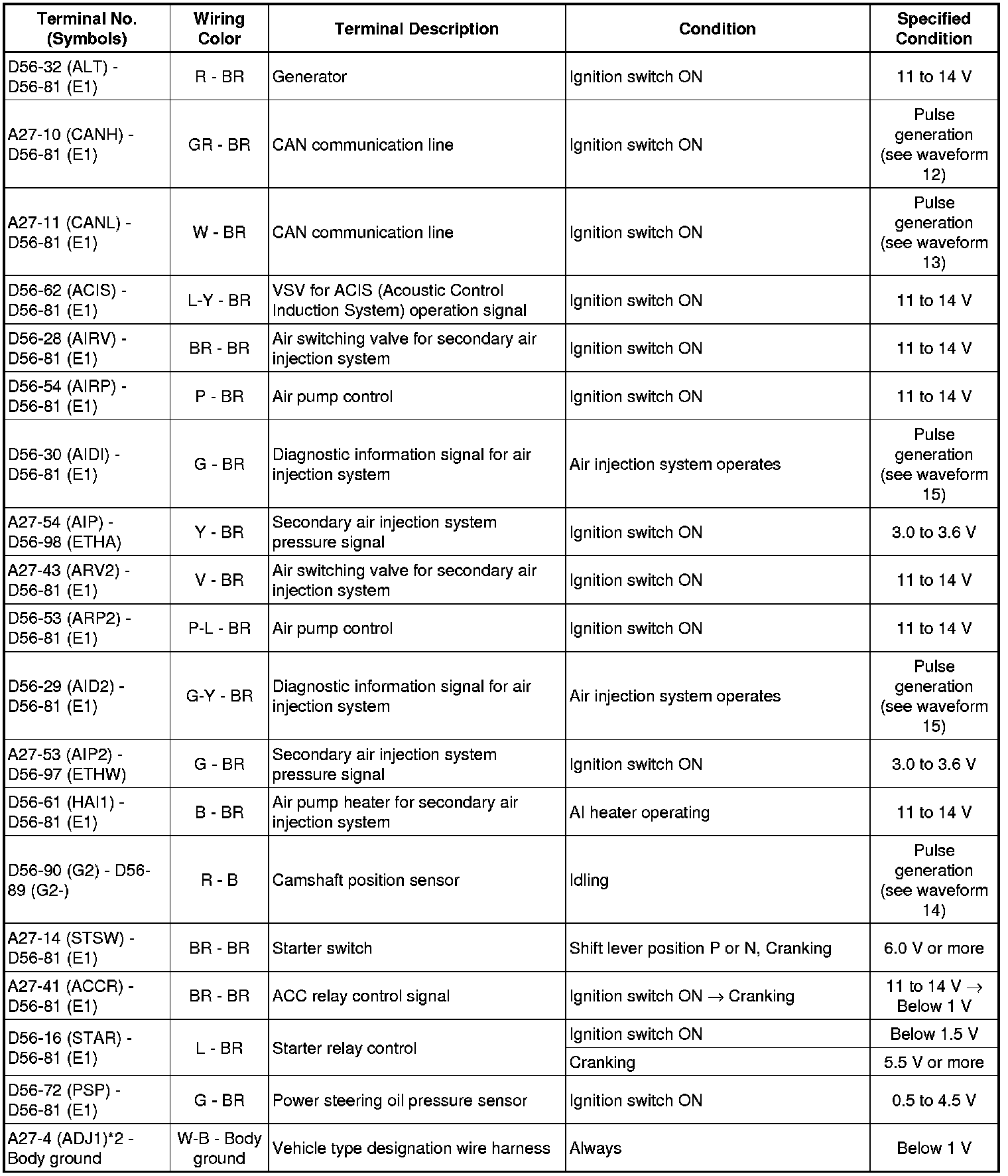 The standard normal voltage between each pair of ECM terminals is shown in the table below. The appropriate conditions for checking each pair of terminals are also indicated. The result of checks should be compared with the standard normal voltage for that pair of terminals, displayed in the Specified Condition column. The illustration above can be used as a reference to identify the ECM terminal locations.