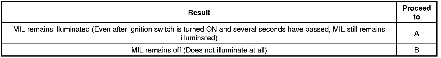 The MIL operation can be checked visually. When the ignition switch is first turned ON, the MIL should illuminate and should then turn off. If the MIL remains illuminated or does not illuminate, conduct the following troubleshooting procedure. If the ECM detects any trouble, the MIL illuminates. At this time, the ECM records a DTC in the memory.