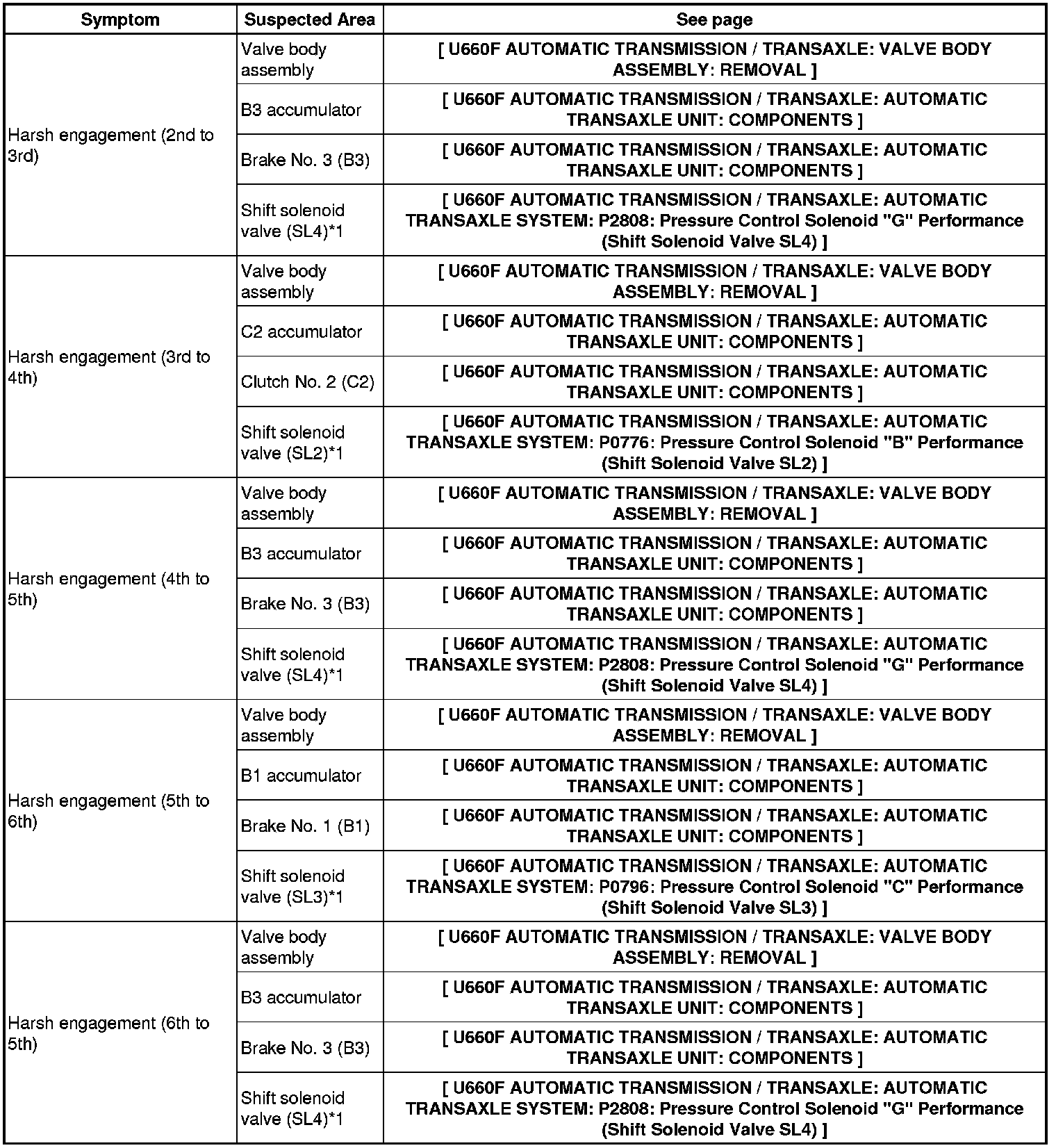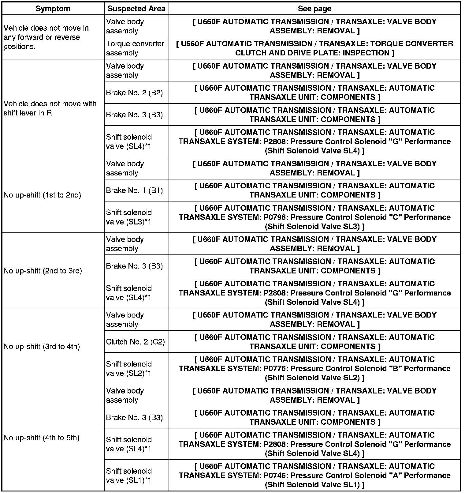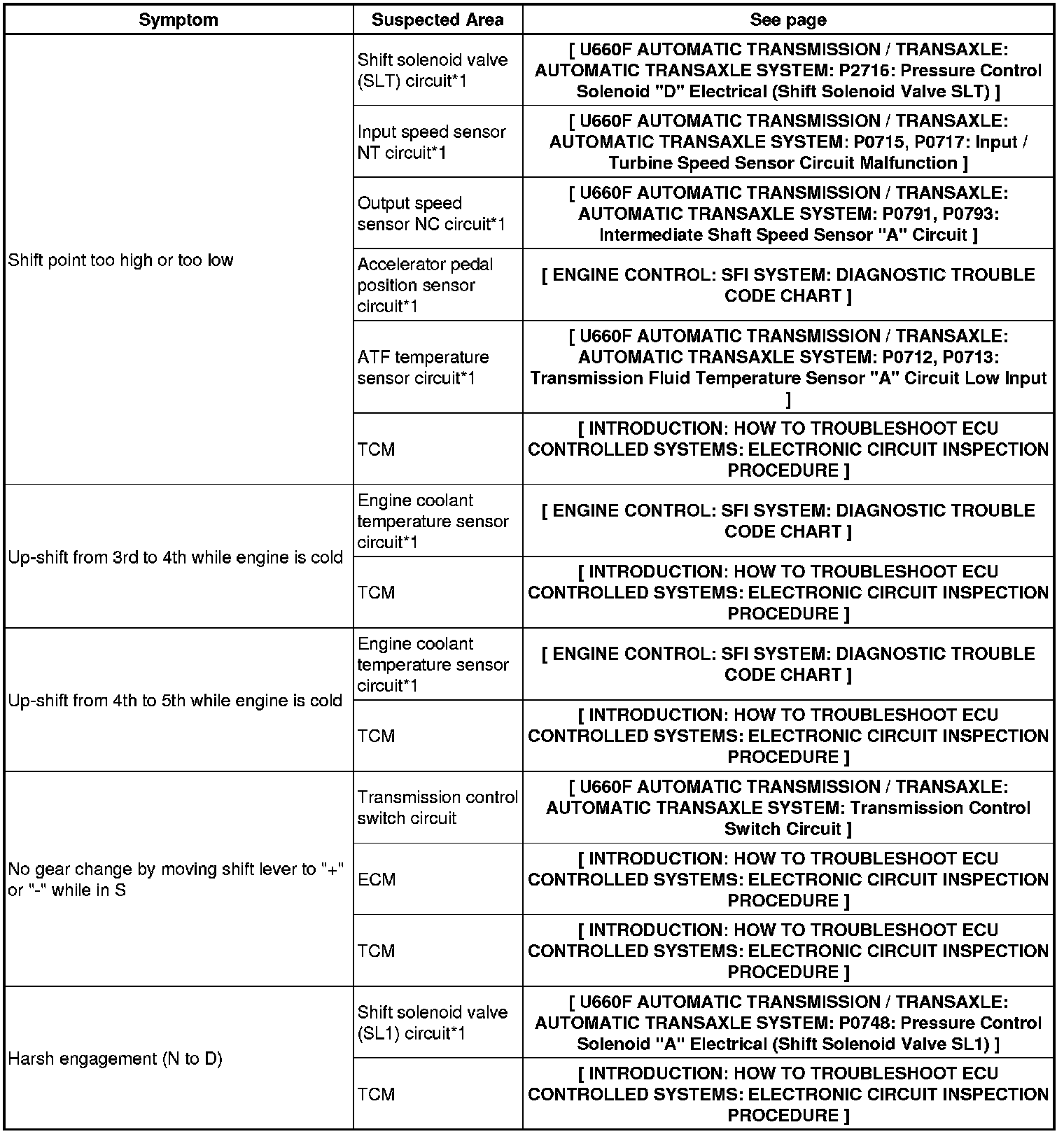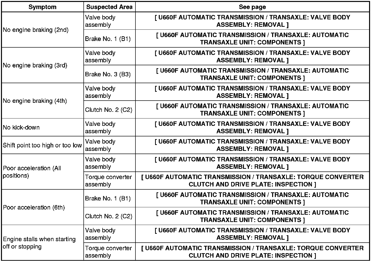 U660F AUTOMATIC TRANSMISSION / TRANSAXLE: AUTOMATIC TRANSAXLE SYSTEM: PROBLEM SYMPTOMS TABLE
