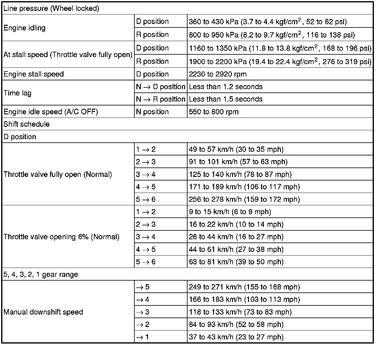SPECIFICATIONS: U660F AUTOMATIC TRANSMISSION / TRANSAXLE: SERVICE DATA
