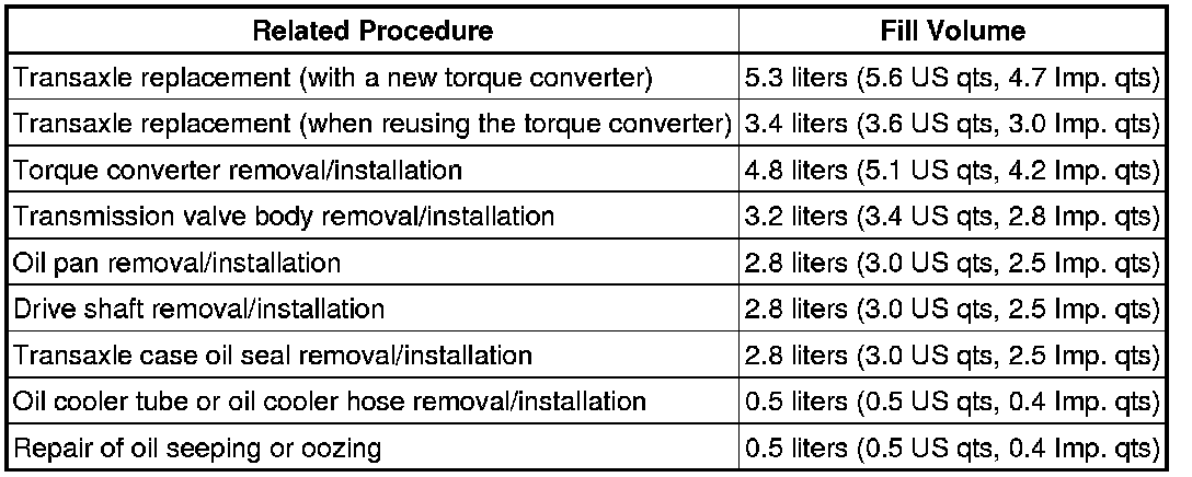 (a) Fill the transaxle with the correct amount of fluid as listed in the table below.