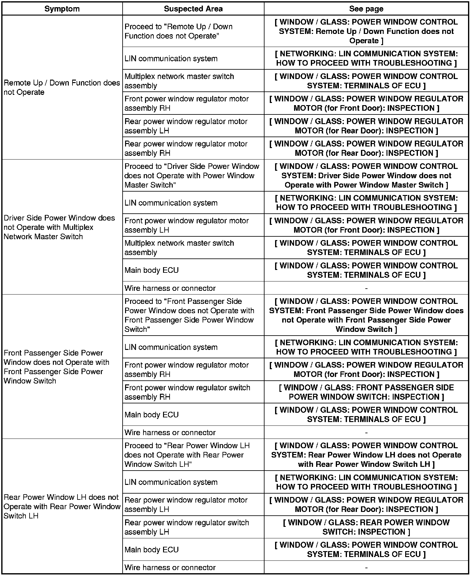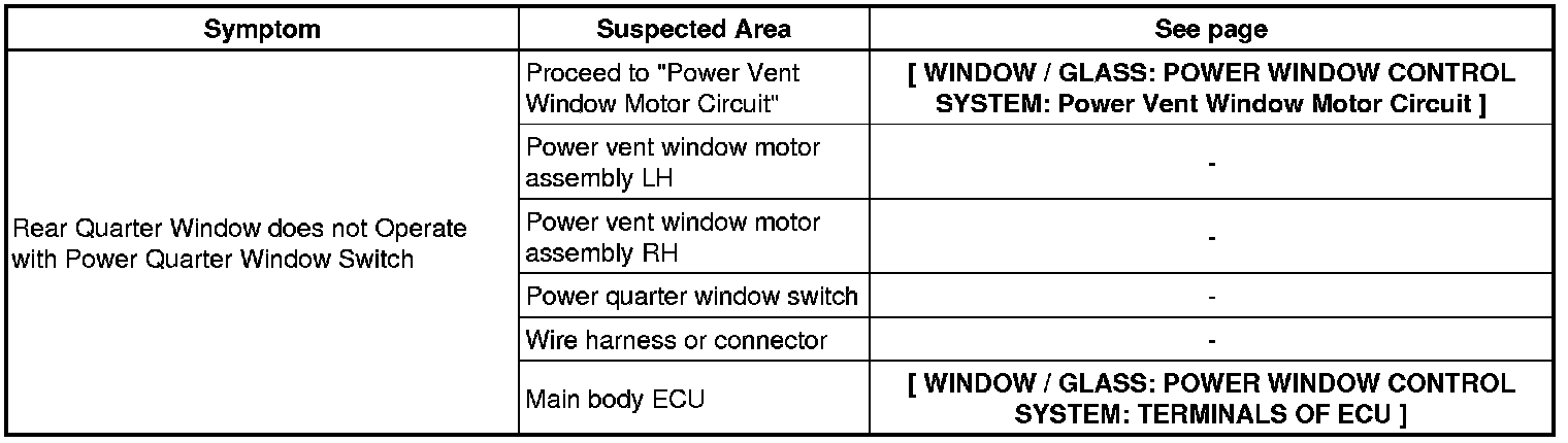 WINDOW / GLASS: POWER WINDOW CONTROL SYSTEM: PROBLEM SYMPTOMS TABLE