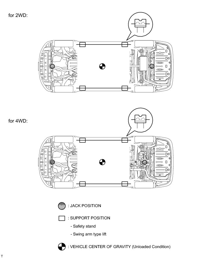 (b) When removing any heavy components like the engine or transaxle, the vehicle center of gravity will shift. To stabilize the vehicle, place a balance weight in a location that will prevent the vehicle from rolling or shifting, or place a transmission jack under the appropriate jack position at the opposite end of the vehicle.