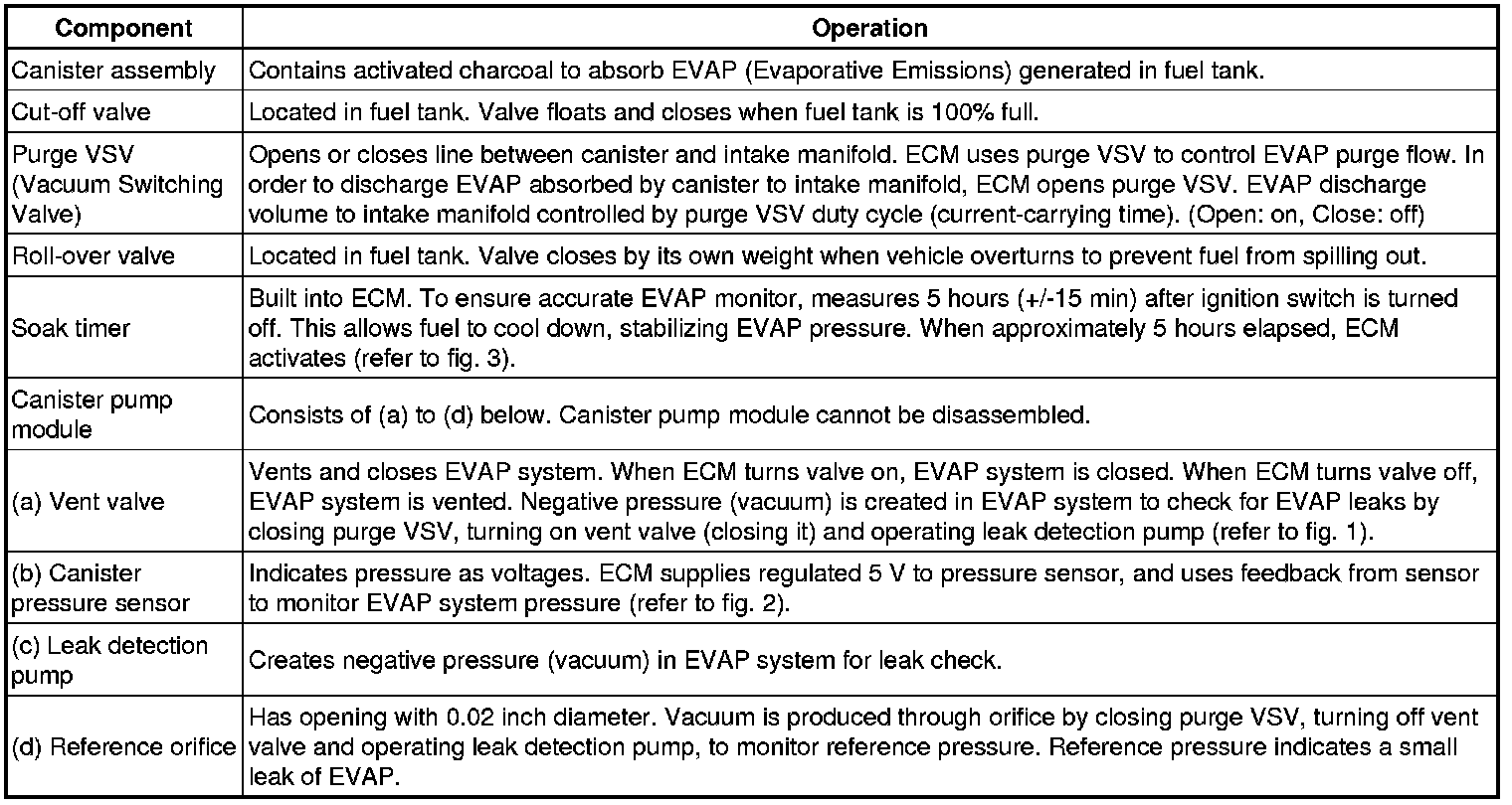 The leak detection pump creates negative pressure (vacuum) in the EVAP system and the pressure is measured. Finally, the ECM monitors for leaks from the EVAP system, and malfunctions in both the canister pump module and purge VSV based on the EVAP pressure.
