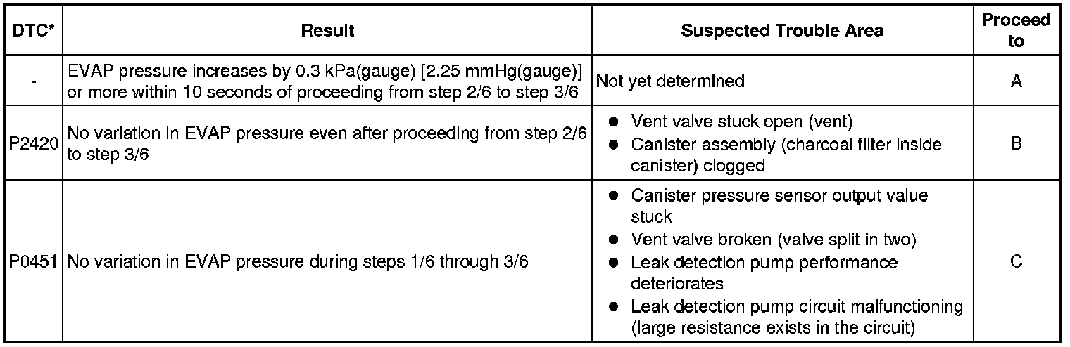 If any EVAP system DTCs are stored, the malfunctioning area can be determined using the table below.