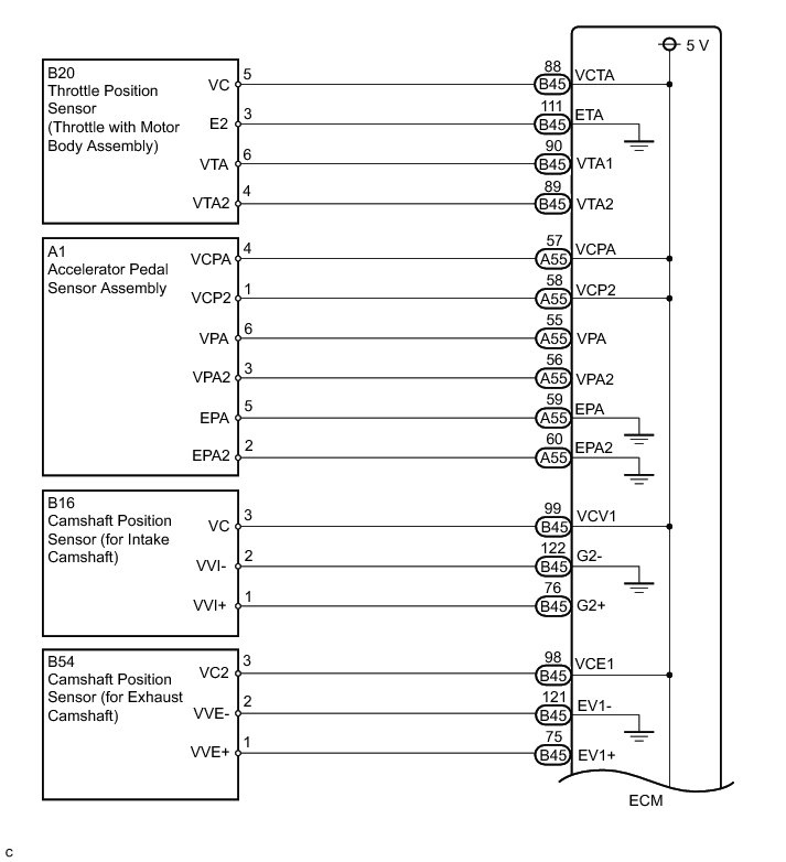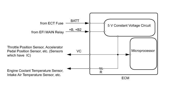 The ECM constantly generates 5 V of power from battery voltage supplied to the +B (BATT) terminal to operate the microprocessor. The ECM also provides this power to the sensors through the VC output circuit.