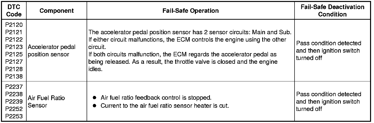 If any of the following DTCs are stored, the ECM enters fail-safe mode to allow the vehicle to be driven temporarily or stops fuel injection.