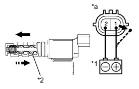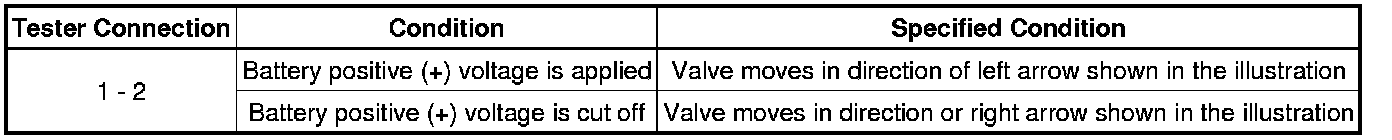 (b) Connect the positive (+) lead from a battery to terminal 1 and the negative (-) lead to terminal 2, and check the movement of the valve.