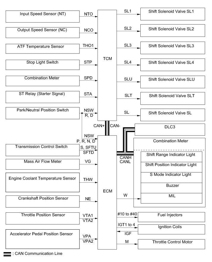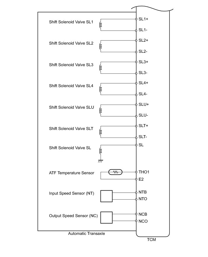 The configuration of the electronic control system in the U760E automatic transaxle is as shown in the following chart.