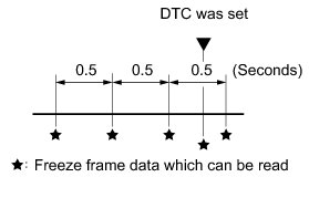 (b) The Techstream records freeze frame data in 5 different instances: 1) 3 times before the DTC is set, 2) once when the DTC is set, and 3) once after the DTC is set. These sets of data can be used to simulate the vehicle condition around the time when the malfunction occurred. The data may help in finding the cause of the malfunction, or in judging if the DTC was caused by a temporary malfunction.
