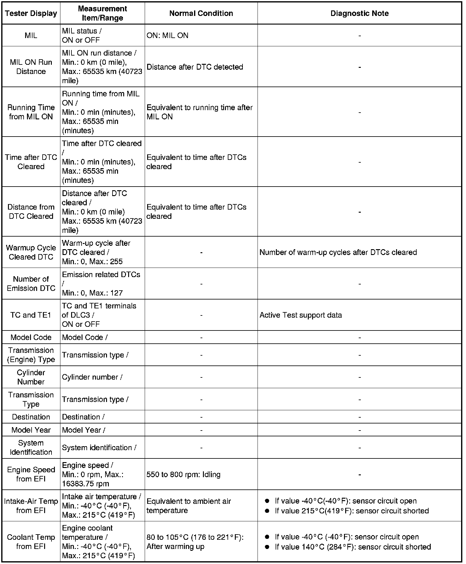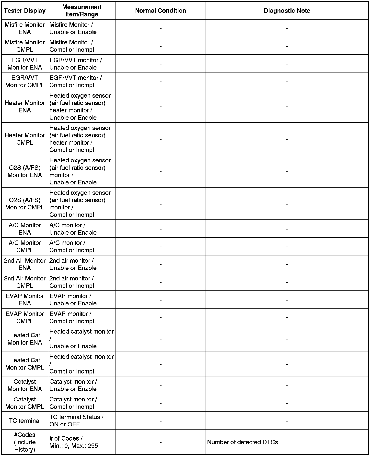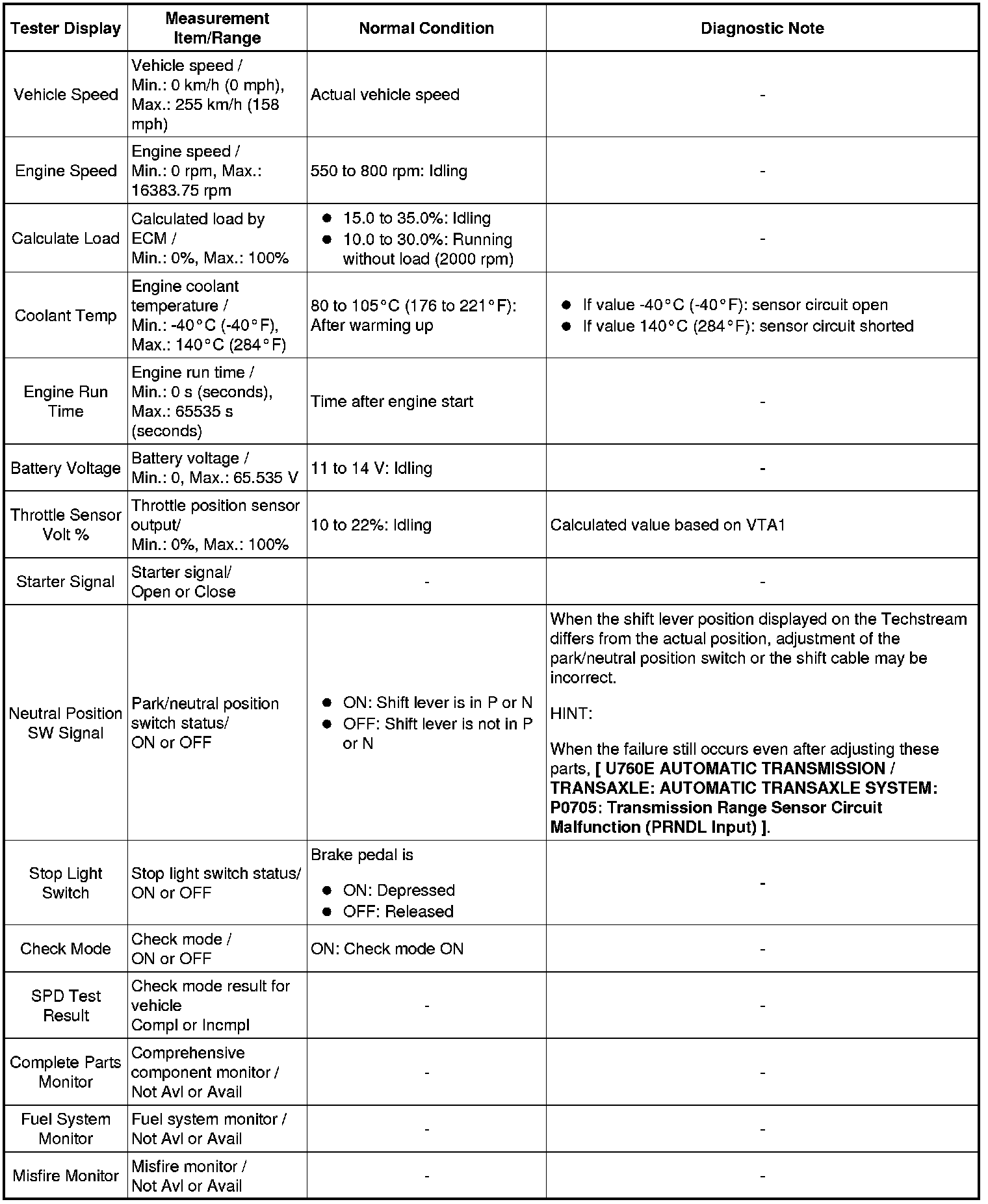 Using the Techstream to read the Data List allows the values or states of switches, sensors, actuators and other items to be read without removing any parts. This non-intrusive inspection can be very useful because intermittent conditions or signals may be discovered before parts or wiring is disturbed. Reading the Data List information early in troubleshooting is one way to save diagnostic time.