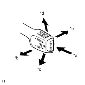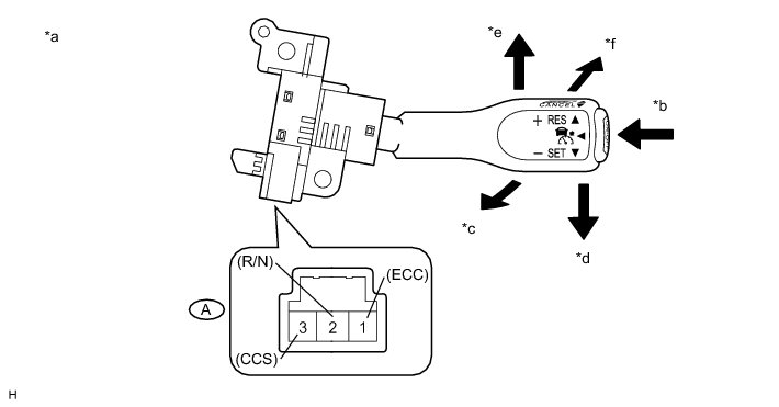 The cruise control main switch operates 8 functions: SET, -(COAST), TAP-DOWN, RES (RESUME), + (ACCEL), TAP-UP, CANCEL, and MODE. The SET, TAP-DOWN, and - (COAST) functions, and the RES (RESUME), TAP-UP, and + (ACCEL) functions are operated with the same switch. The cruise control main switch is an automatic return type switch which turns on only while operating it in the direction of each arrow and turns off after releasing it. The internal contact point of the cruise control main switch is turned on with the switch operation. The ECM then reads the voltage value that has been changed by the switch operation to control MODE, SET, - (COAST), RES (RESUME), + (ACCEL), and CANCEL. The dynamic radar cruise control system has two cruise control modes: the constant speed control mode and vehicle-to-vehicle distance control mode.