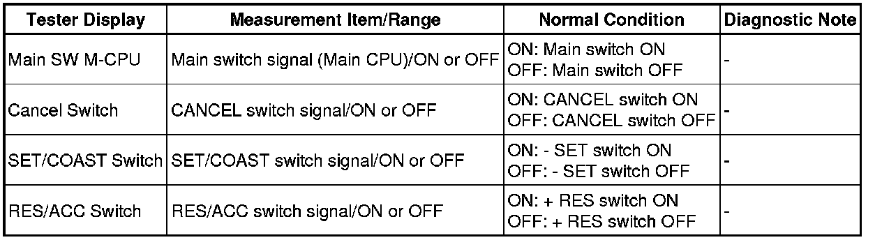 (e) Check the Data List for proper functioning of the cruise control main switch.