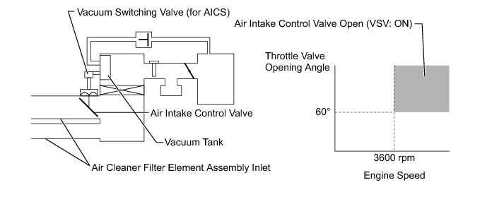 When the engine is operating in the low-to-mid speed range, this control operates the air intake control valve to close one of the air cleaner filter element sub-assembly inlets. When the engine speed is more than 3600 rpm and the opening angle of the throttle valve is more than 60°, the ECM activates the vacuum switching valve (for AICS) and opens the air intake control valve.