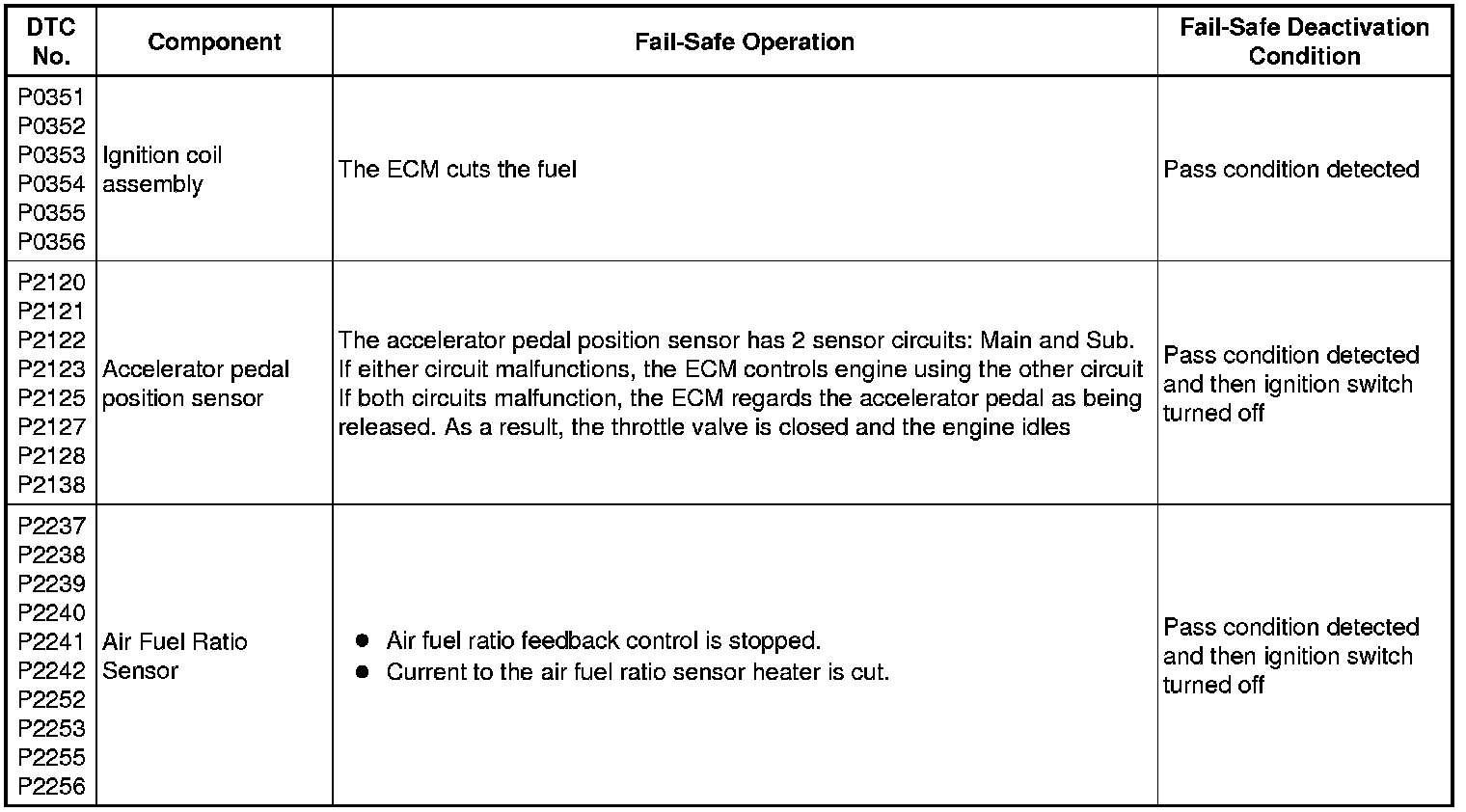 If any of the following DTCs are stored, the ECM enters fail-safe mode to allow the vehicle to be driven temporarily.