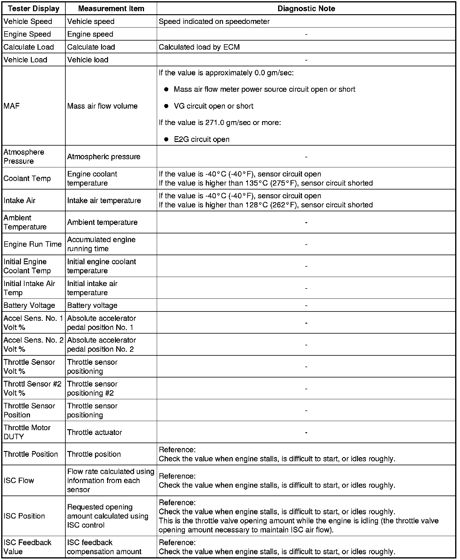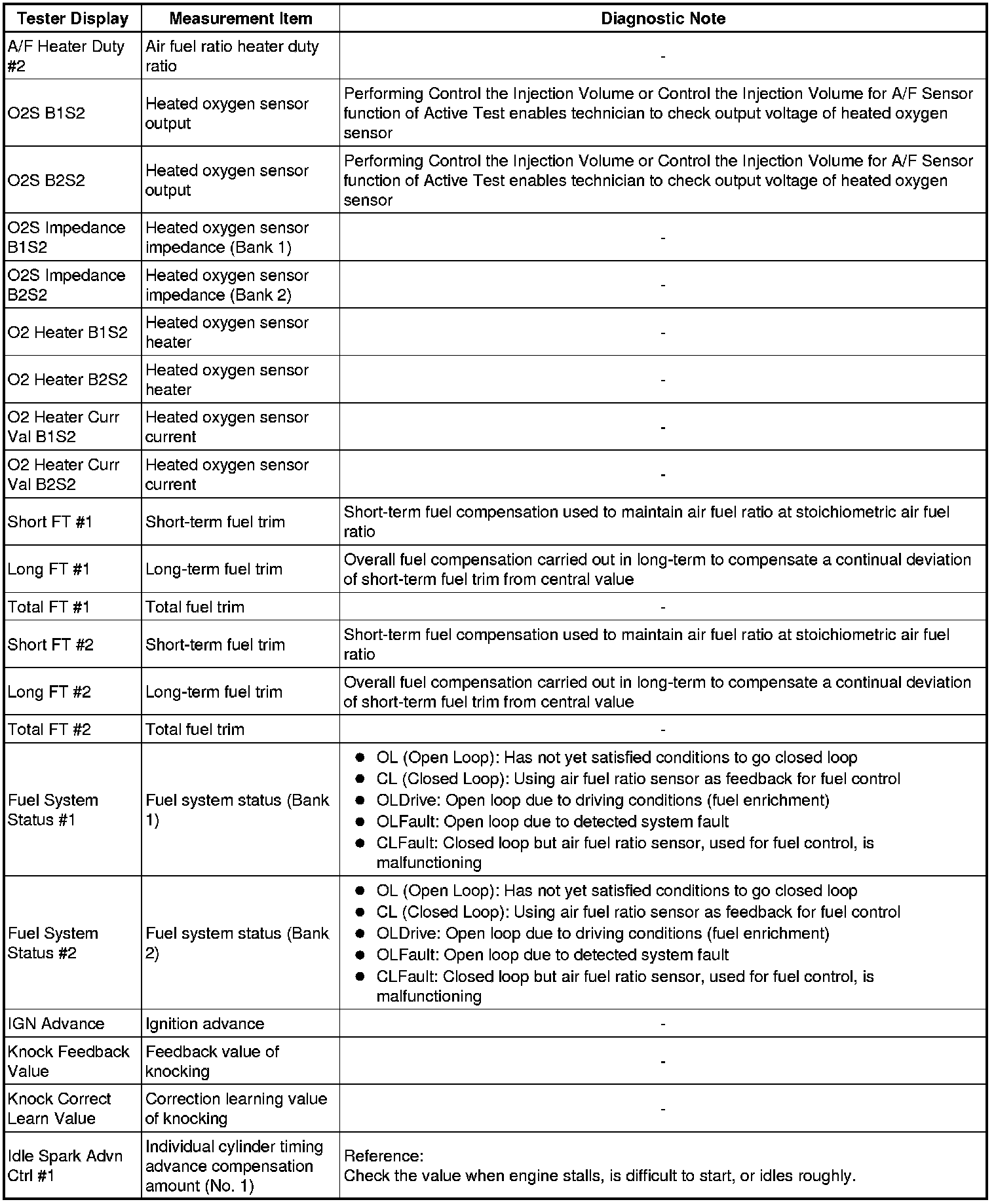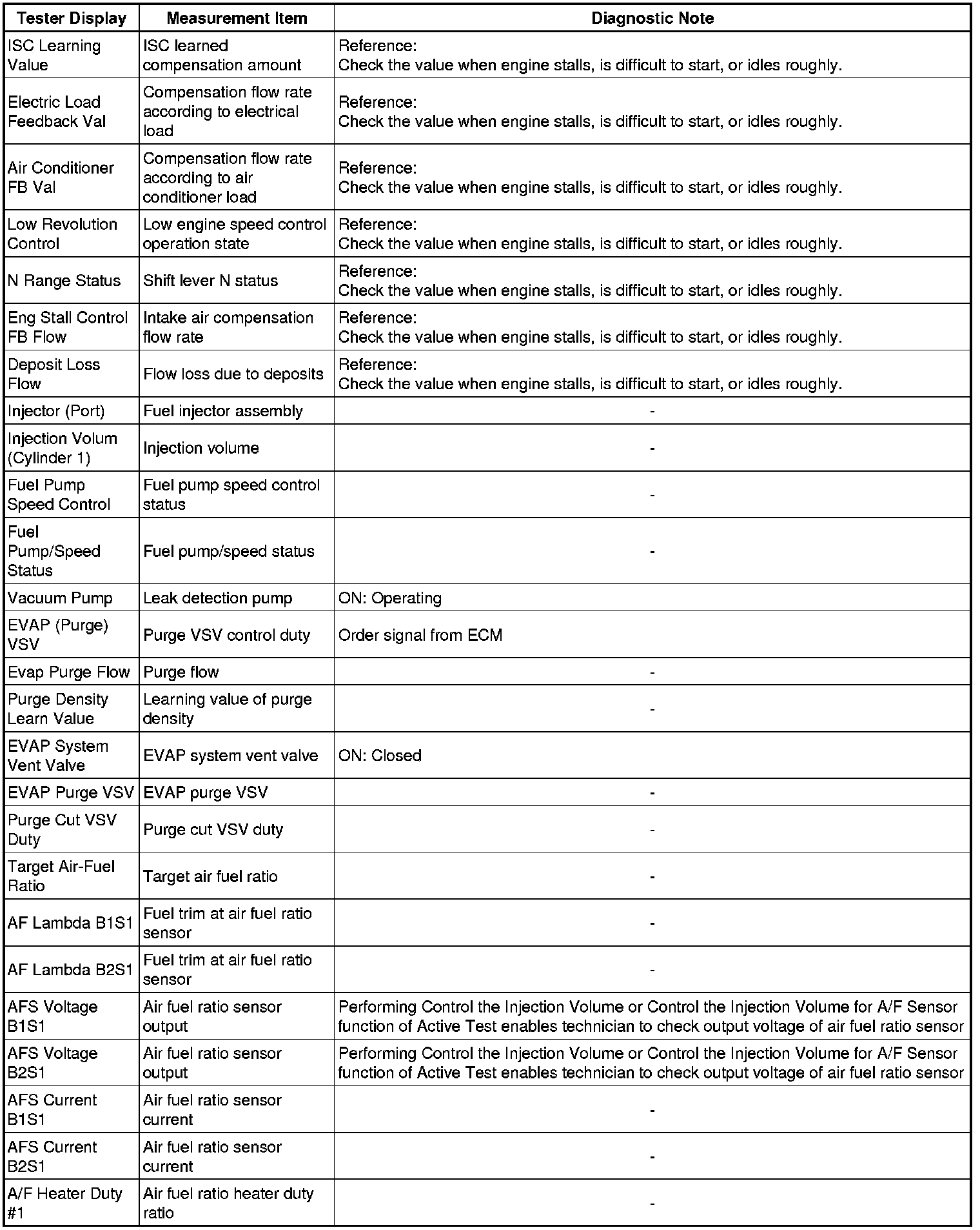 * The ECM records vehicle and driving condition information as freeze frame data the moment a DTC is stored. When troubleshooting, freeze frame data can be helpful in determining whether the vehicle was running or stopped, whether the engine was warmed up or not, whether the air fuel ratio was lean or rich, as well as other data recorded at the time of a malfunction.