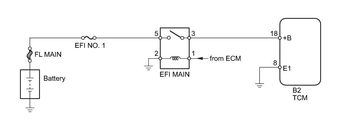When the ignition switch is turned to ON, voltage from the ECM MREL terminal is applied to the EFI MAIN relay. This causes the contacts of the EFI MAIN relay to close, which supplies power to terminal +B of the TCM.