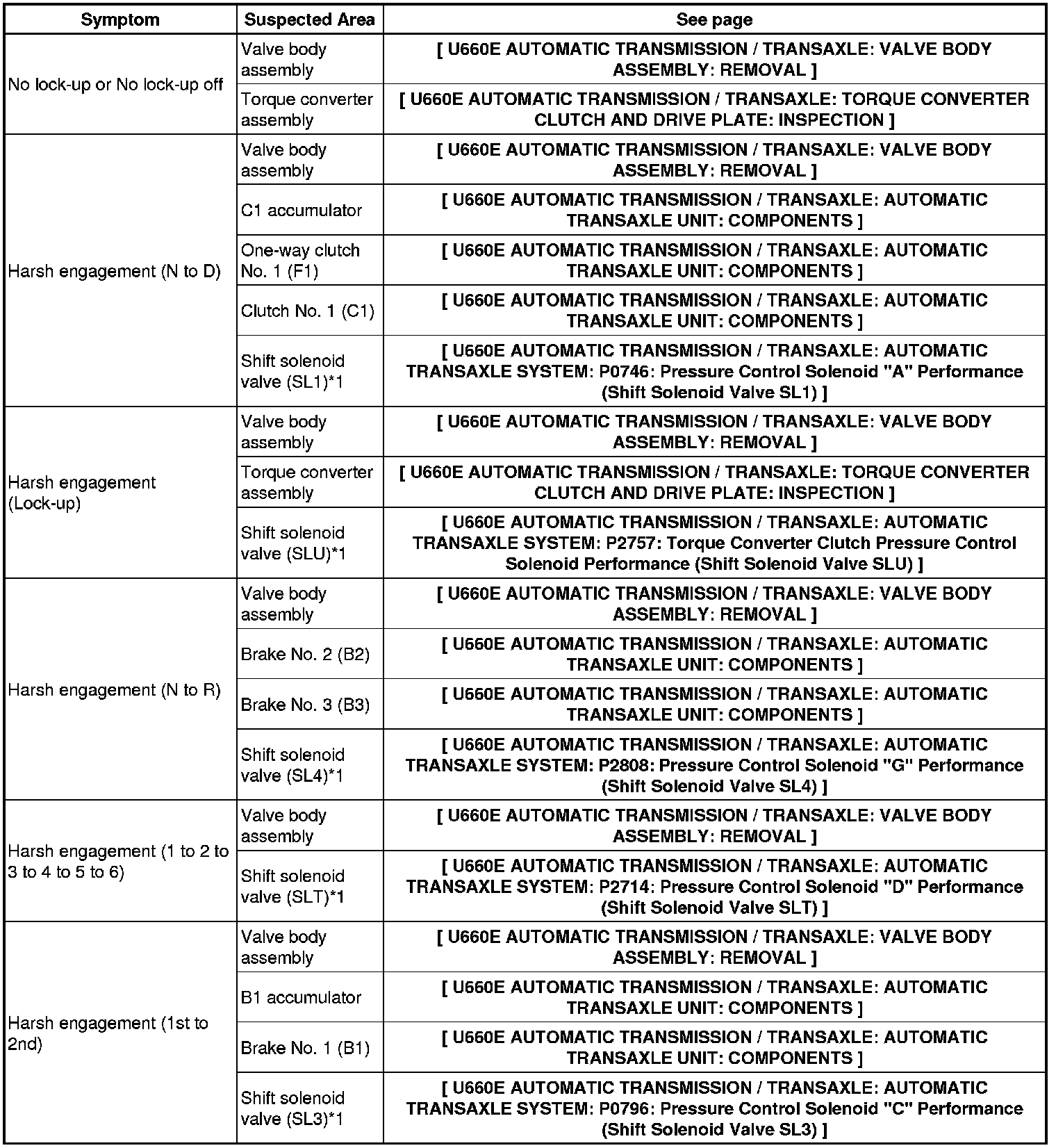U660E AUTOMATIC TRANSMISSION / TRANSAXLE: AUTOMATIC TRANSAXLE SYSTEM: PROBLEM SYMPTOMS TABLE