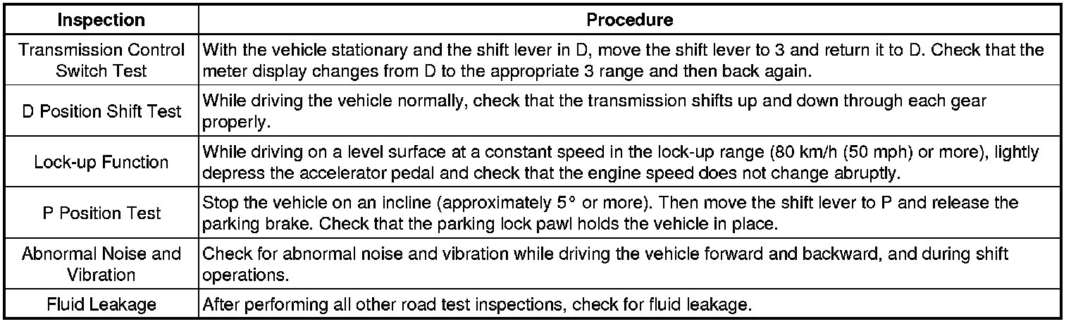 * Perform the road test with the engine coolant temperature between 60 and 100°C (140 and 212°F) and the ATF temperature between 50 and 100°C (122 and 212°F).
