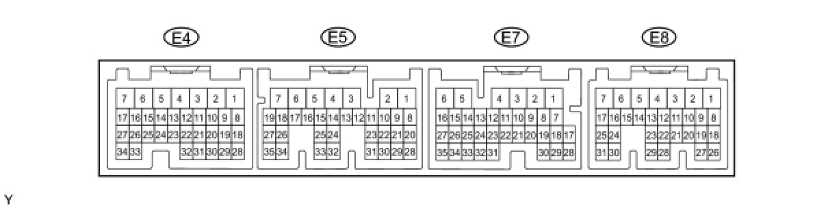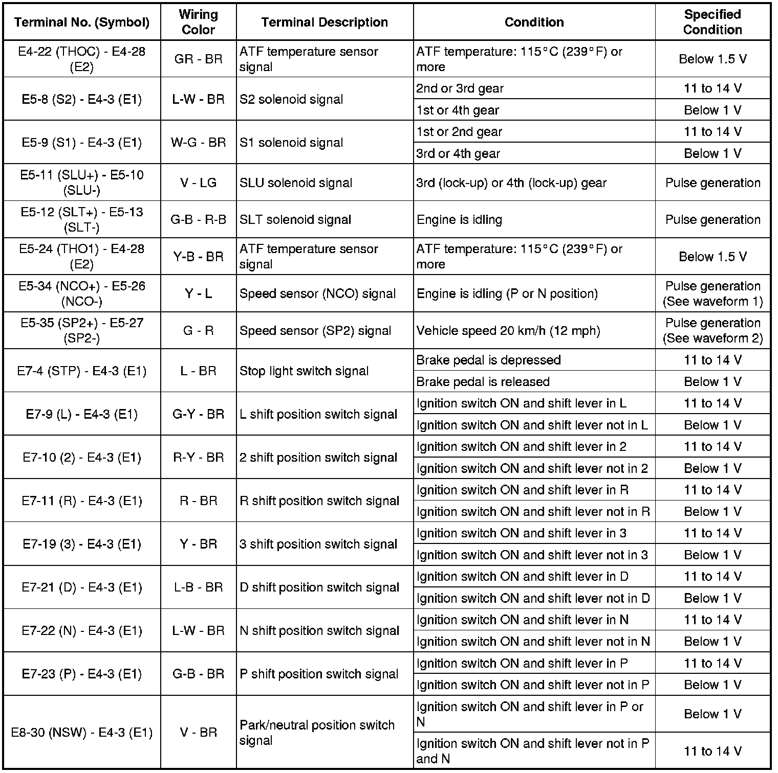 In the table, first follow the information under "Condition". Look under "Terminal No. (Symbol)" for the terminals to be inspected. The standard voltage between the terminals is shown under "Specified Condition". Use the illustration above as a reference for the ECM terminals.