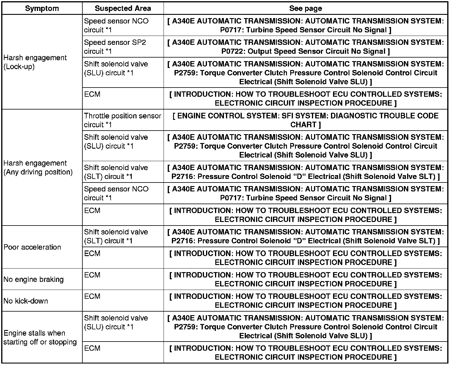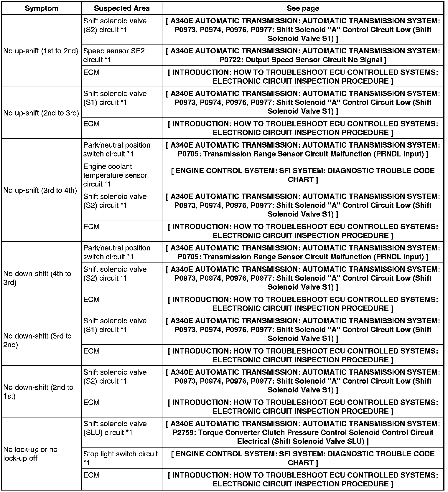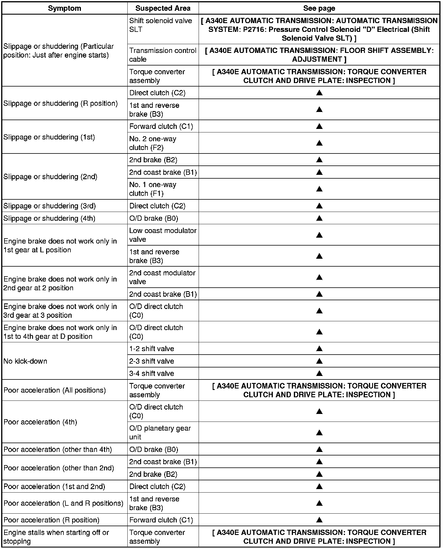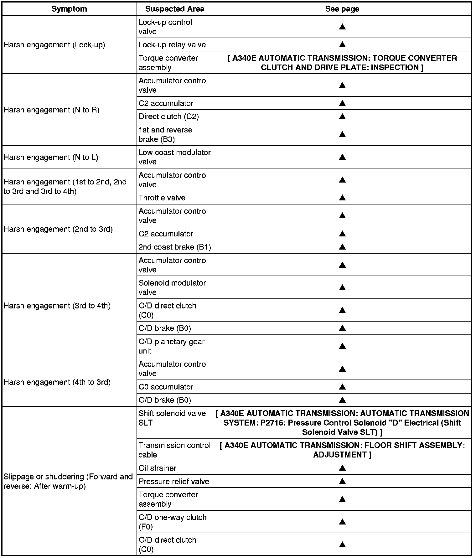 A340E AUTOMATIC TRANSMISSION: AUTOMATIC TRANSMISSION SYSTEM: PROBLEM SYMPTOMS TABLE