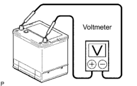 (4) Using a voltmeter, measure the battery voltage between the negative (-) and positive (+) terminals of the battery.