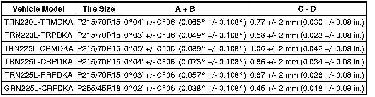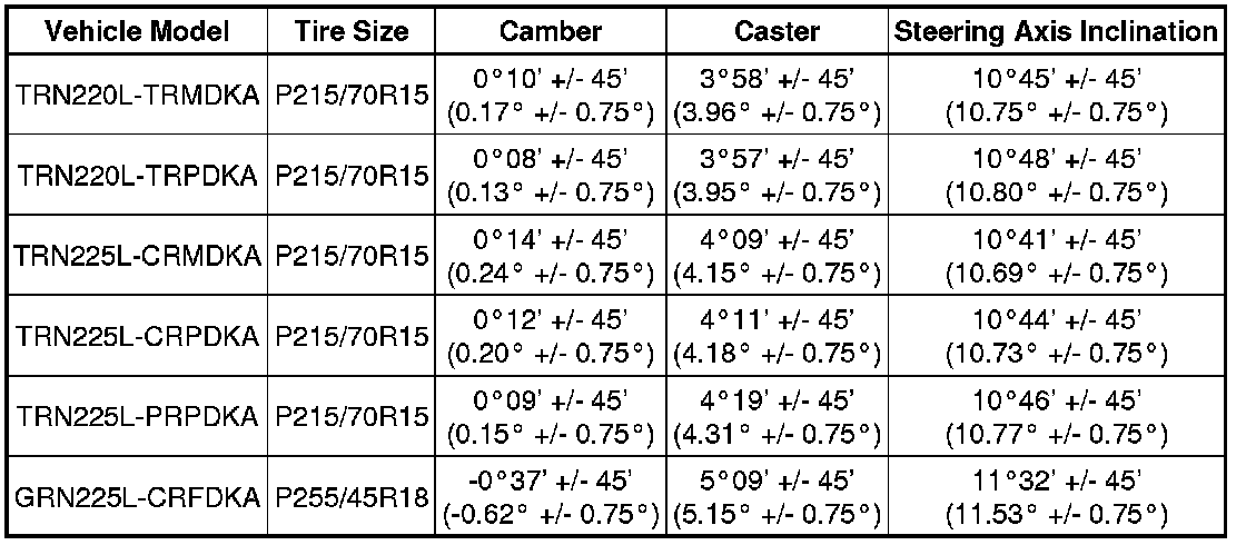 * The tolerance for the difference between the left and right wheels is 0°30' (0.50°) or less for both the camber and caster.