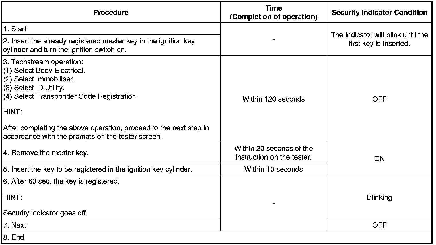 The automatic key code registration mode can be forced to end when 1 or more key codes (immobiliser code) for the master key has been registered.