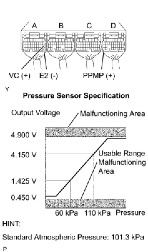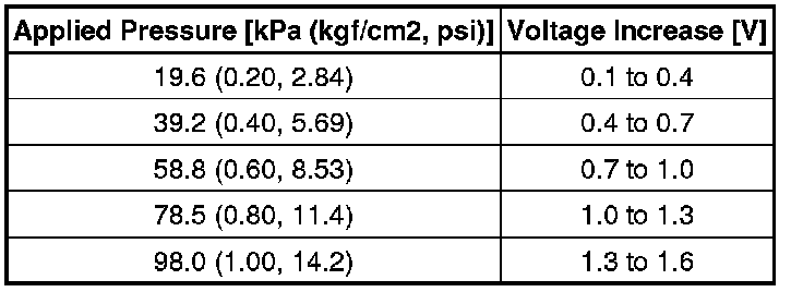 (1) Using SST (turbocharger pressure gauge), apply air to the turbo pressure sensor at the pressures shown in the table below.