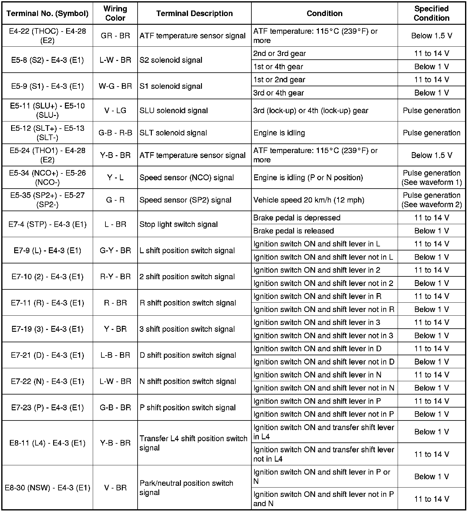 In the table, first follow the information under "Condition". Look under "Terminal No. (Symbol)" for the terminals to be inspected. The standard voltage between the terminals is shown under "Specified Condition". Use the illustration above as a reference for the ECM terminals.