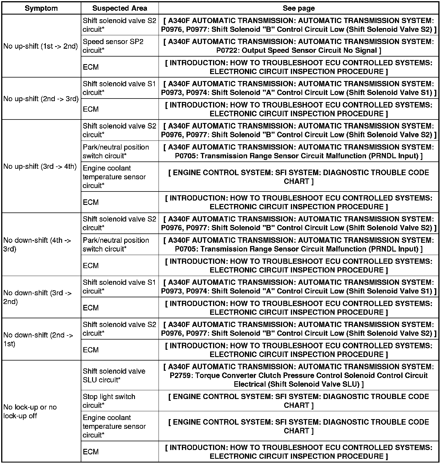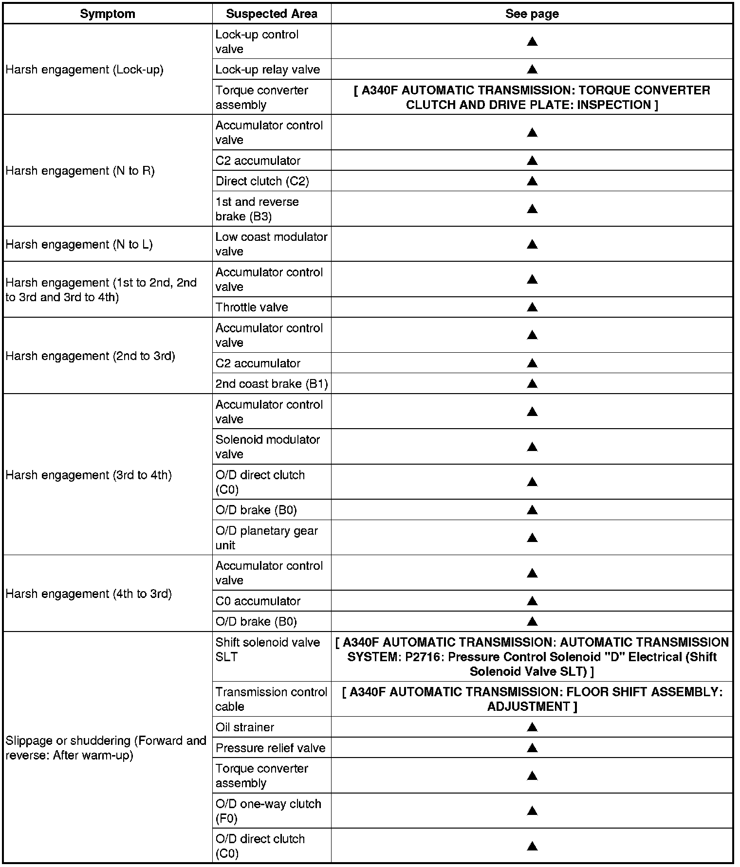 A340F AUTOMATIC TRANSMISSION: AUTOMATIC TRANSMISSION SYSTEM: PROBLEM SYMPTOMS TABLE
