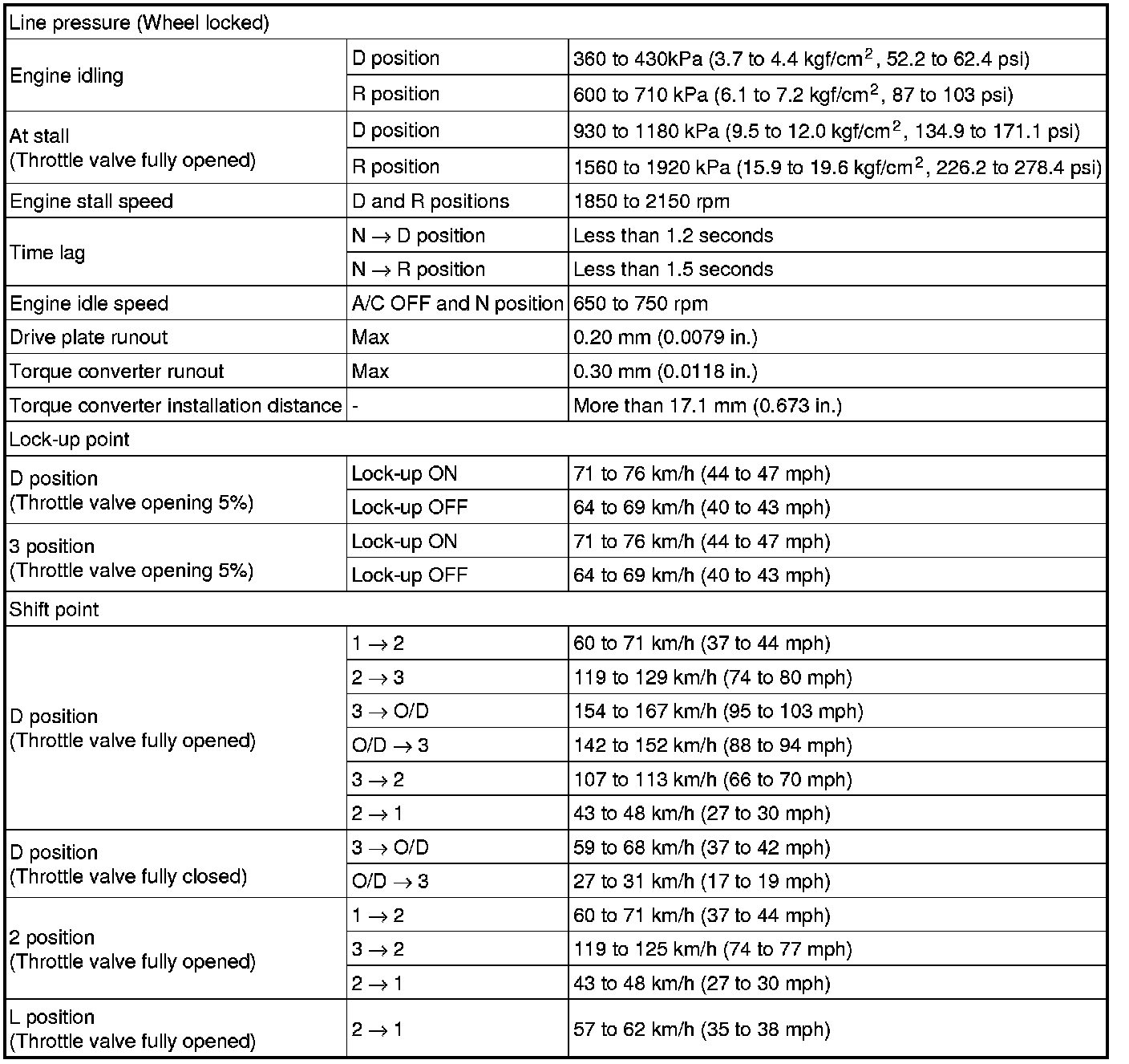 SERVICE SPECIFICATIONS: A340F AUTOMATIC TRANSMISSION: SERVICE DATA