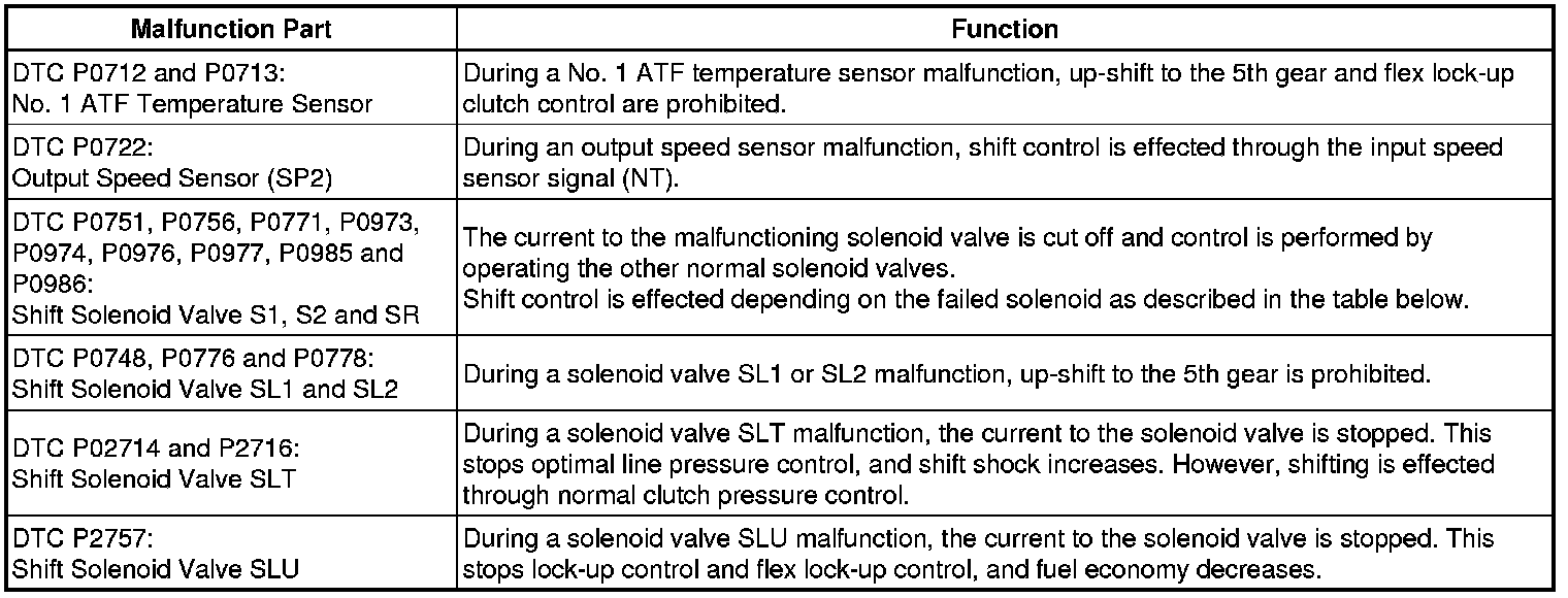 If any of the shift solenoid valve circuits has an open or short failure, the ECM turns the other shift solenoid ON and OFF in order to shift into the gear positions shown in the table below.