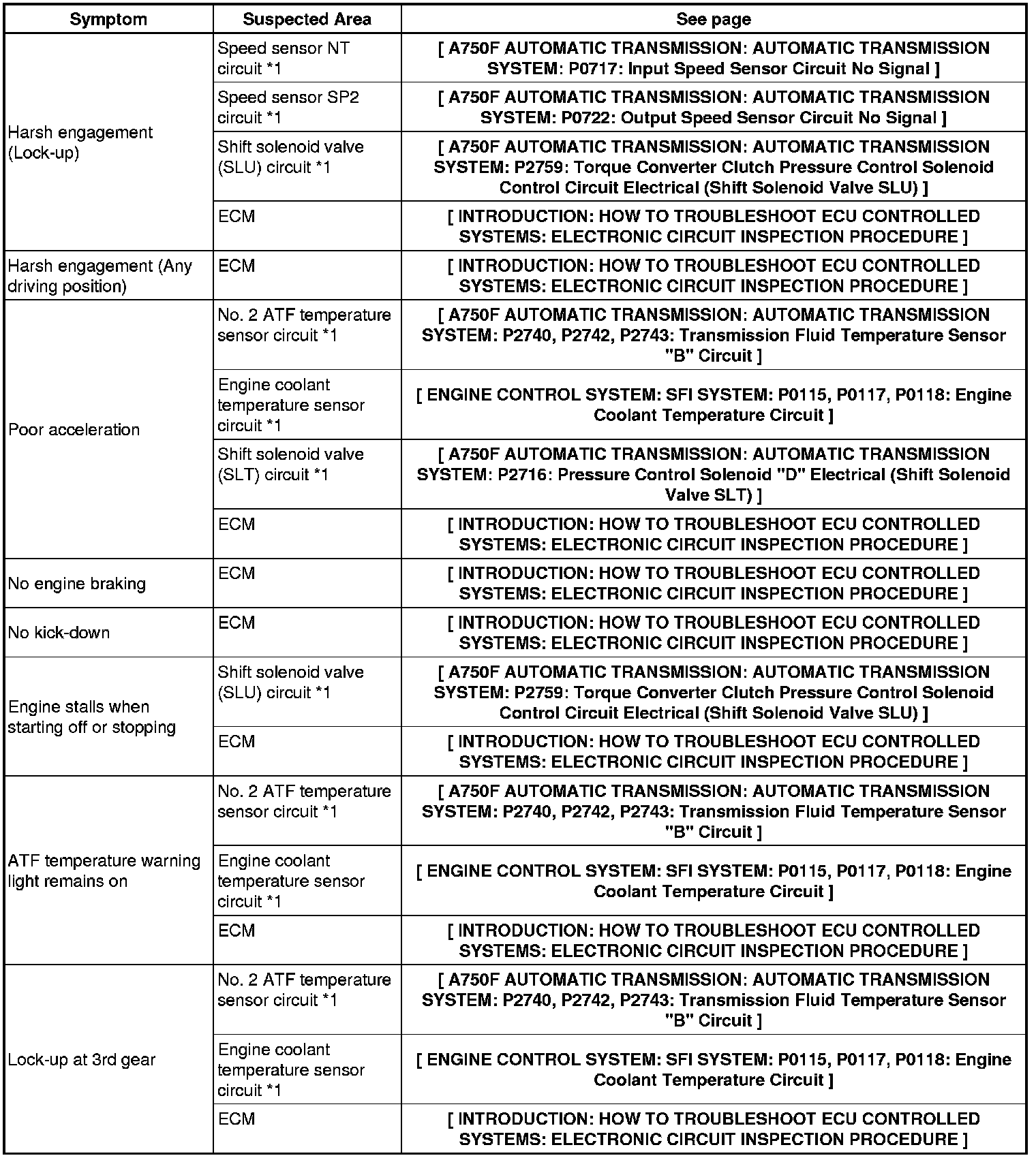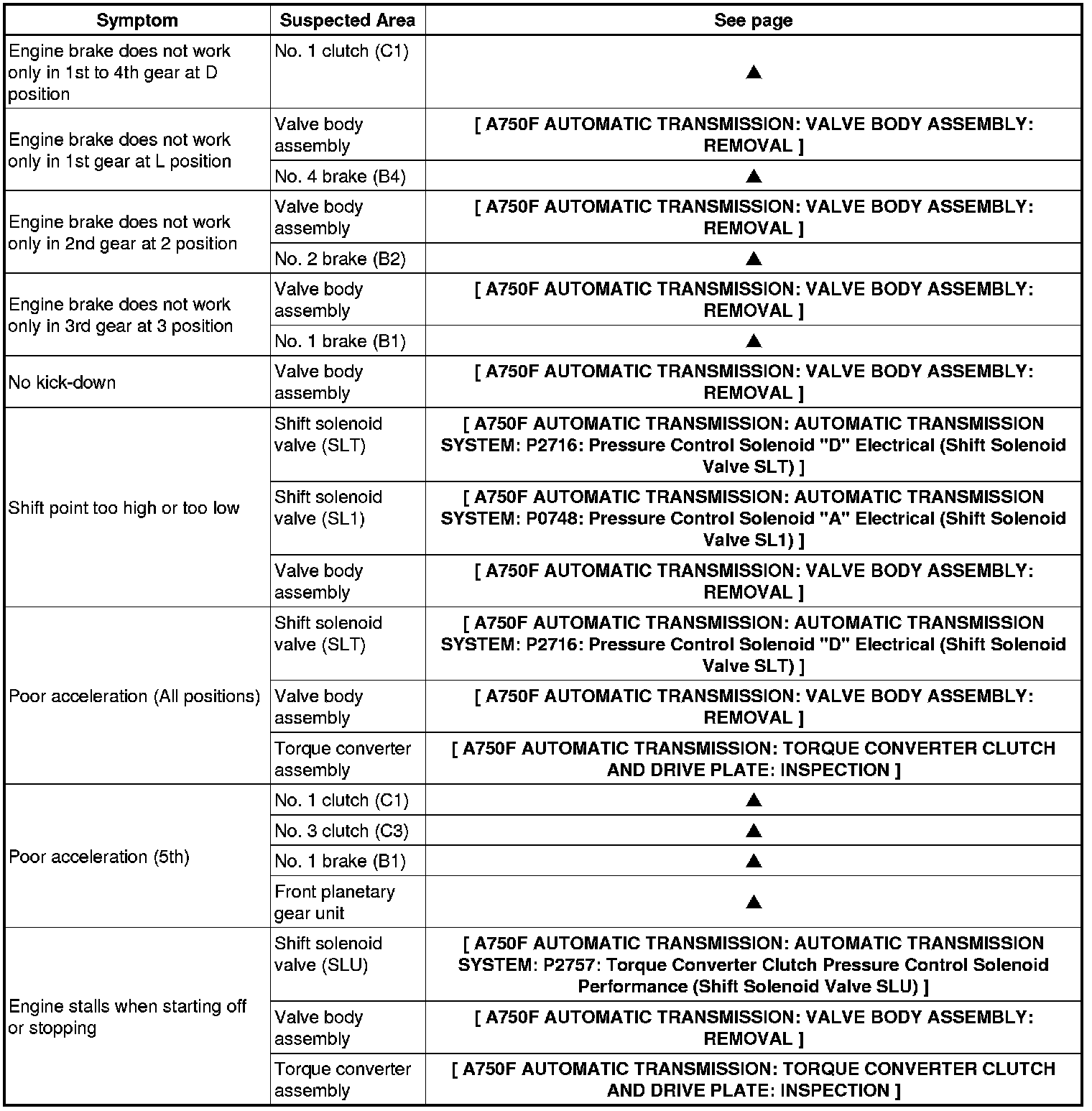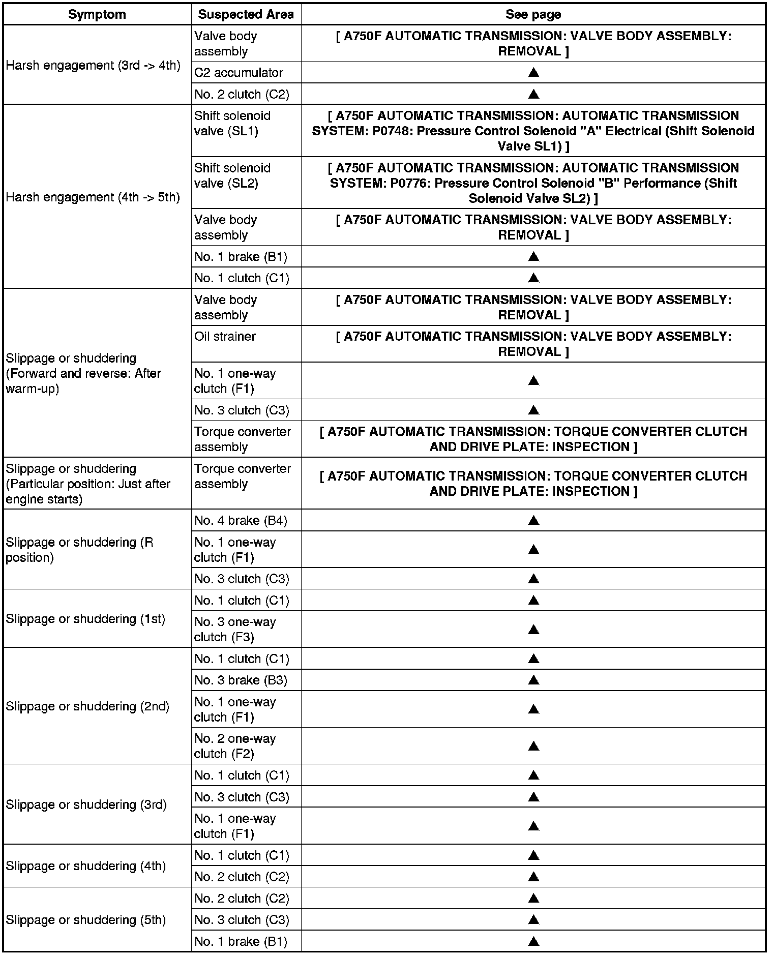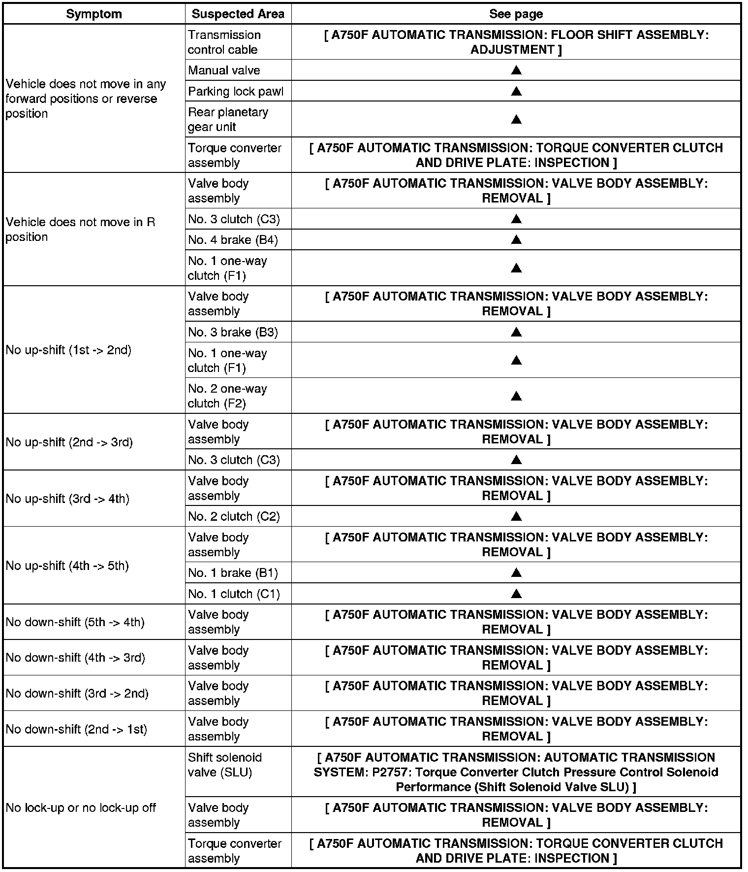 A750F AUTOMATIC TRANSMISSION: AUTOMATIC TRANSMISSION SYSTEM: PROBLEM SYMPTOMS TABLE