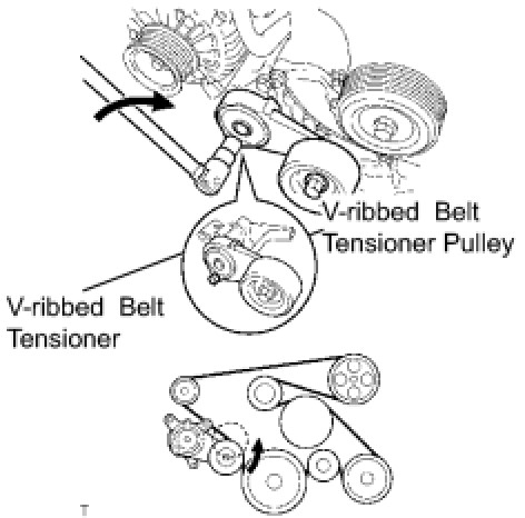 Install the V belt onto each pulley and finally install the V belt onto the V-ribbed belt tensioner.