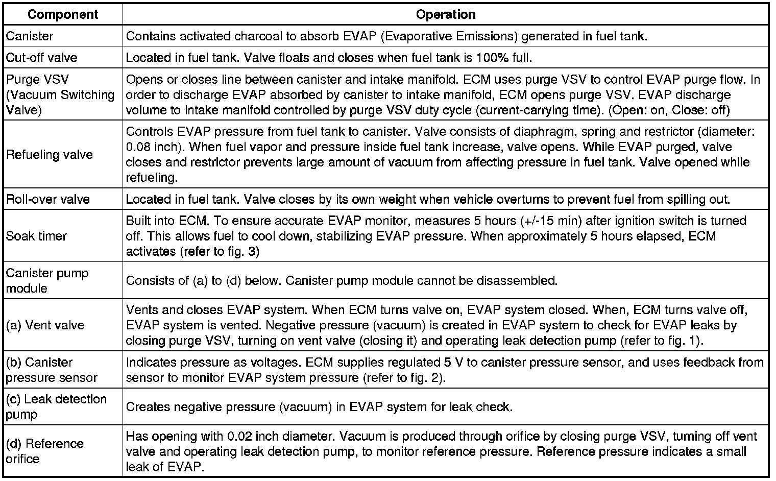 The leak detection pump creates negative pressure (vacuum) in the EVAP system and the pressure is measured. Finally, the ECM monitors for leaks from the EVAP system, and malfunctions in both the canister pump module and purge VSV based on the EVAP pressure.