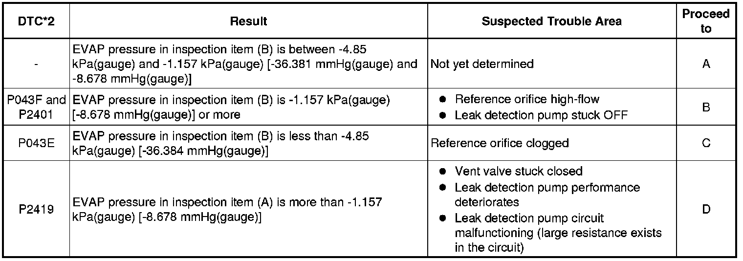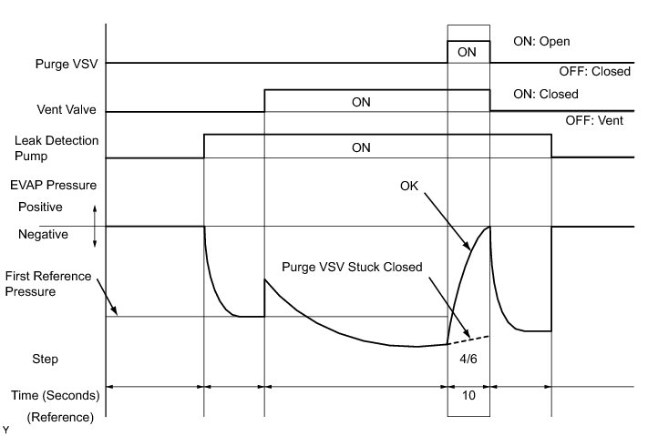If the reference pressure difference between the first and second checks is more than the specification, all the DTCs relating to the reference pressure (P043E, P043F, P0441, P0455, P0456, P2401, P2420) will all be stored.