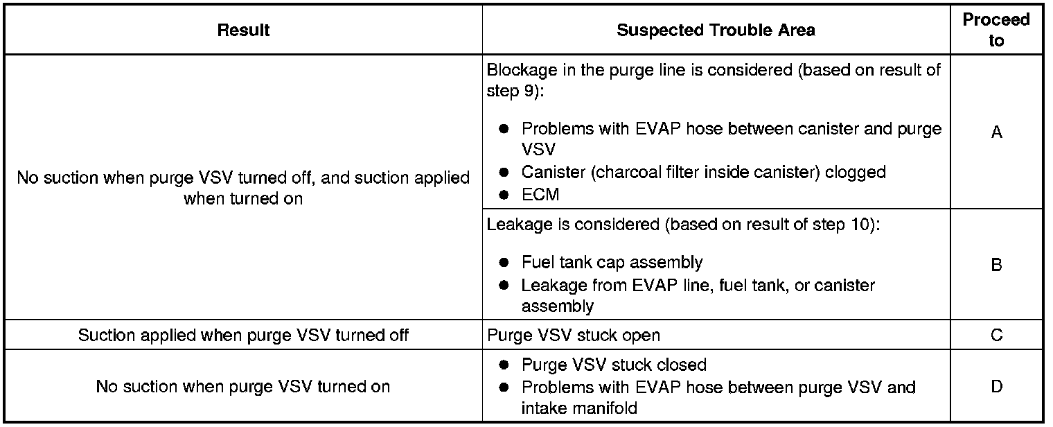 If any EVAP system DTCs are stored, the malfunctioning area can be determined using the table below.